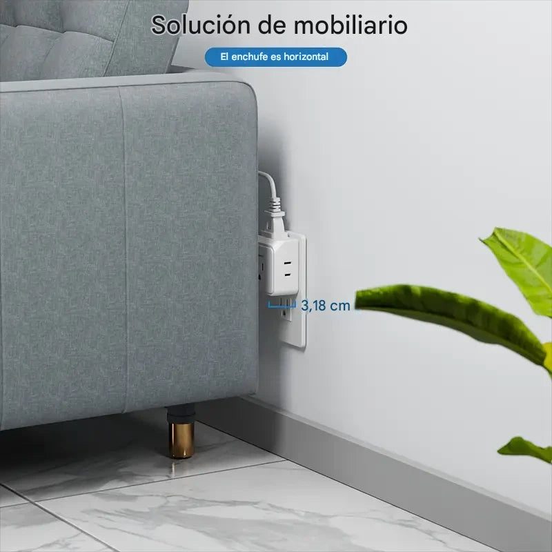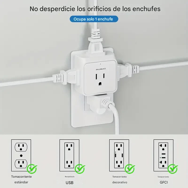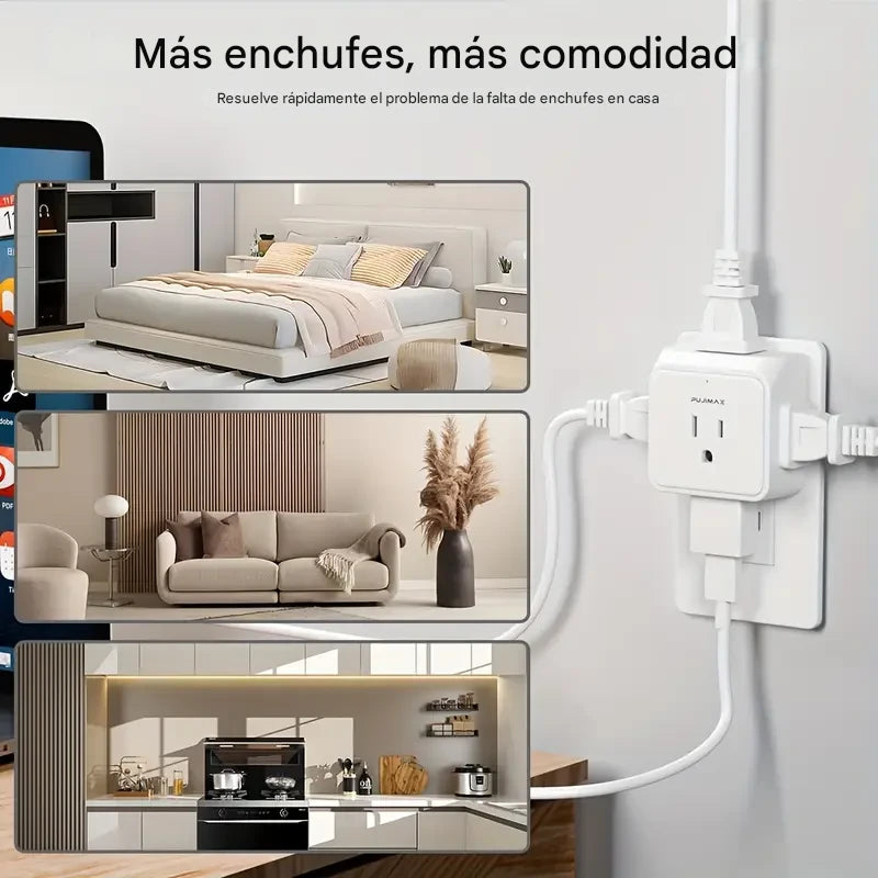 Diseño todo en uno: Combina una toma de corriente tradicional con puertos USB, eliminando el desorden de cables y adaptadores múltiples.