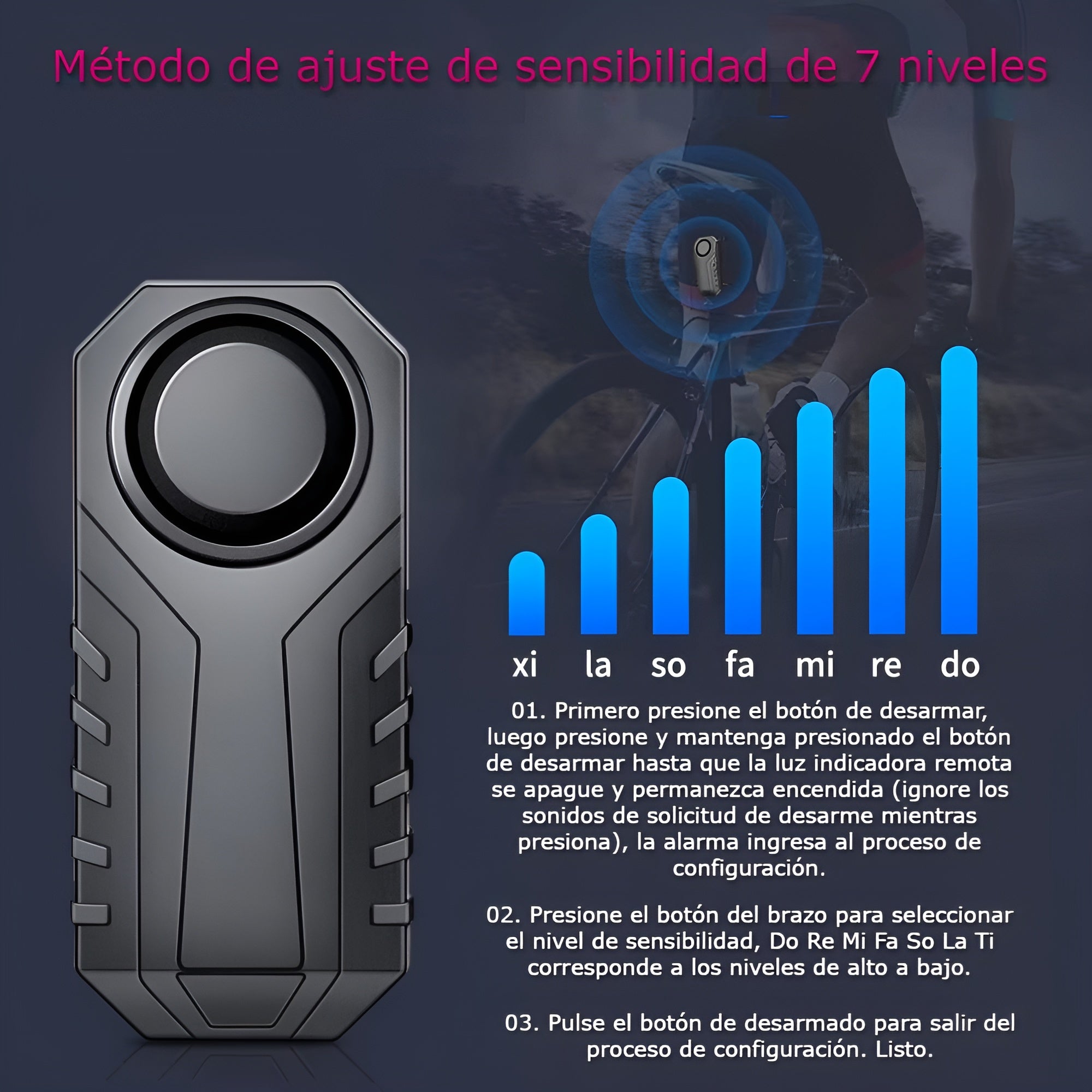 La sensibilidad puede ajustarse en 7 niveles, adaptándose desde movimientos leves hasta impactos fuertes. Incluye control remoto inalámbrico para activar o desactivar la alarma fácilmente, además de 6 sonidos de campana para localizar tu vehículo con rapidez.