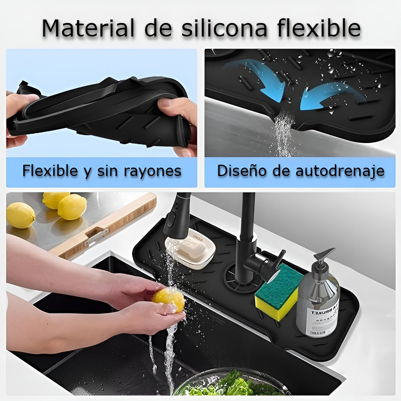 Gracias a su sistema de drenaje , el agua fluye directamente al fregadero, manteniendo la encimera seca y libre de humedad. A diferencia de las alfombrillas de tela, esta versión en silicona no requiere lavado constante, lo que la convierte en una opción higiénica y de bajo mantenimiento.