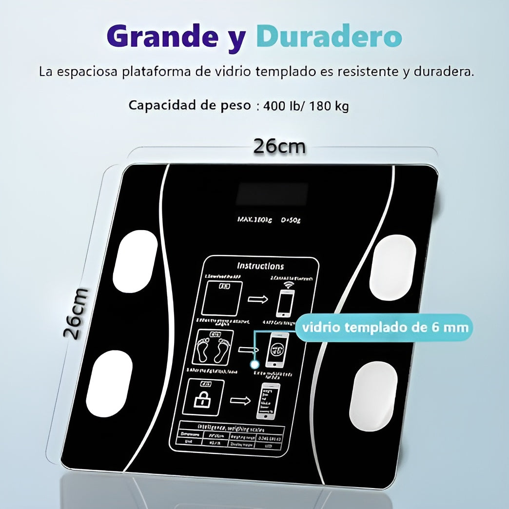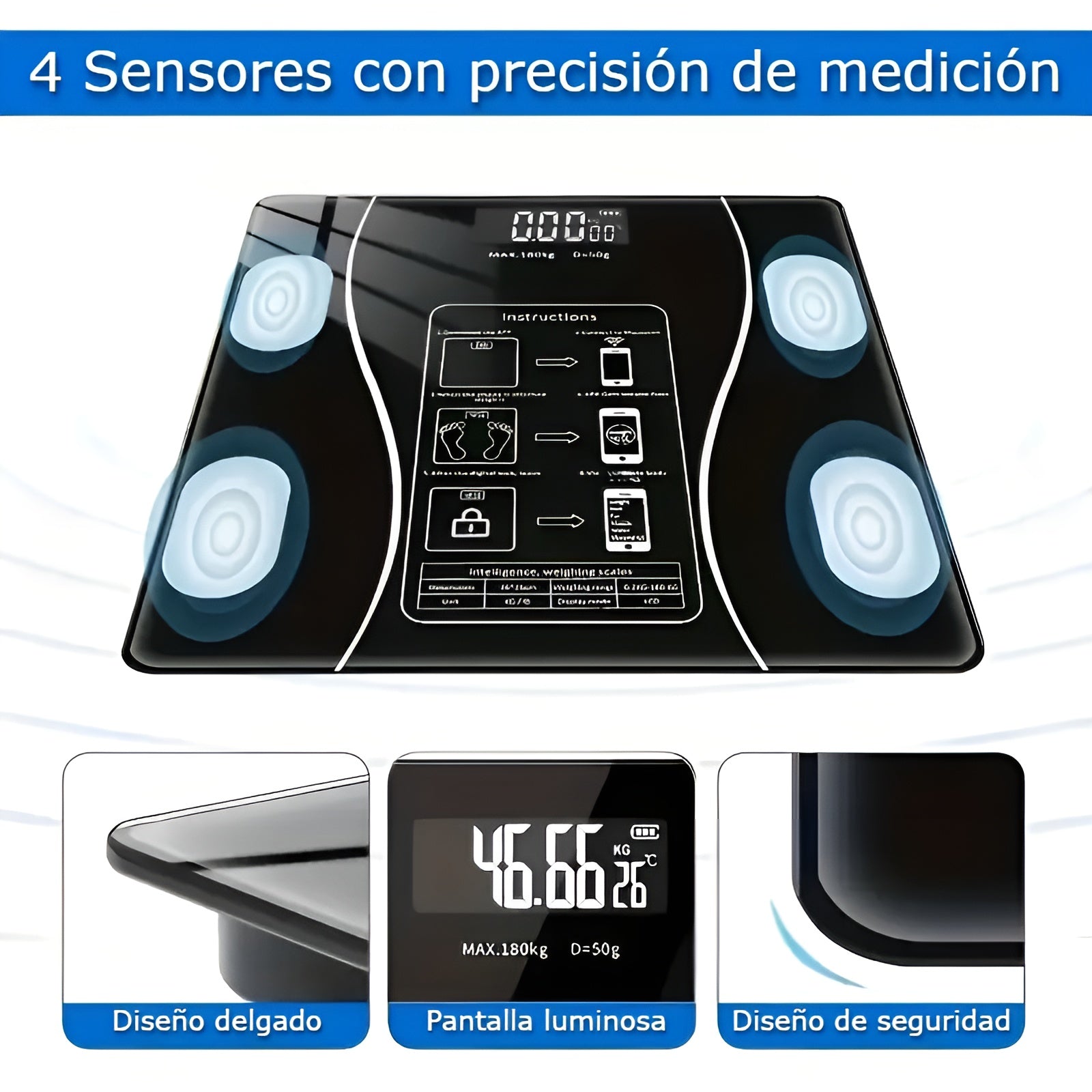 Leer más...Controla tu salud con esta báscula inteligente con Bluetooth Recargable, diseñada para ofrecer 13 métricas corporales precisas como IMC, grasa corporal, masa muscular, proteína, edad metabólica y mucho más. Perfecta para el hogar, te permite hacer seguimiento de múltiples perfiles desde tu Teléfono.