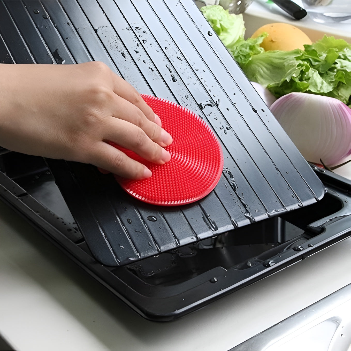 Su diseño ecológico incluye un nano recubrimiento antiadherente que evita que los alimentos se peguen y facilita la limpieza. Las ranuras incorporadas permiten drenar el líquido desprendido durante el proceso, manteniendo tu encimera limpia y ordenada. Además, los pies antideslizantes en cada esquina aseguran estabilidad y seguridad durante su uso.