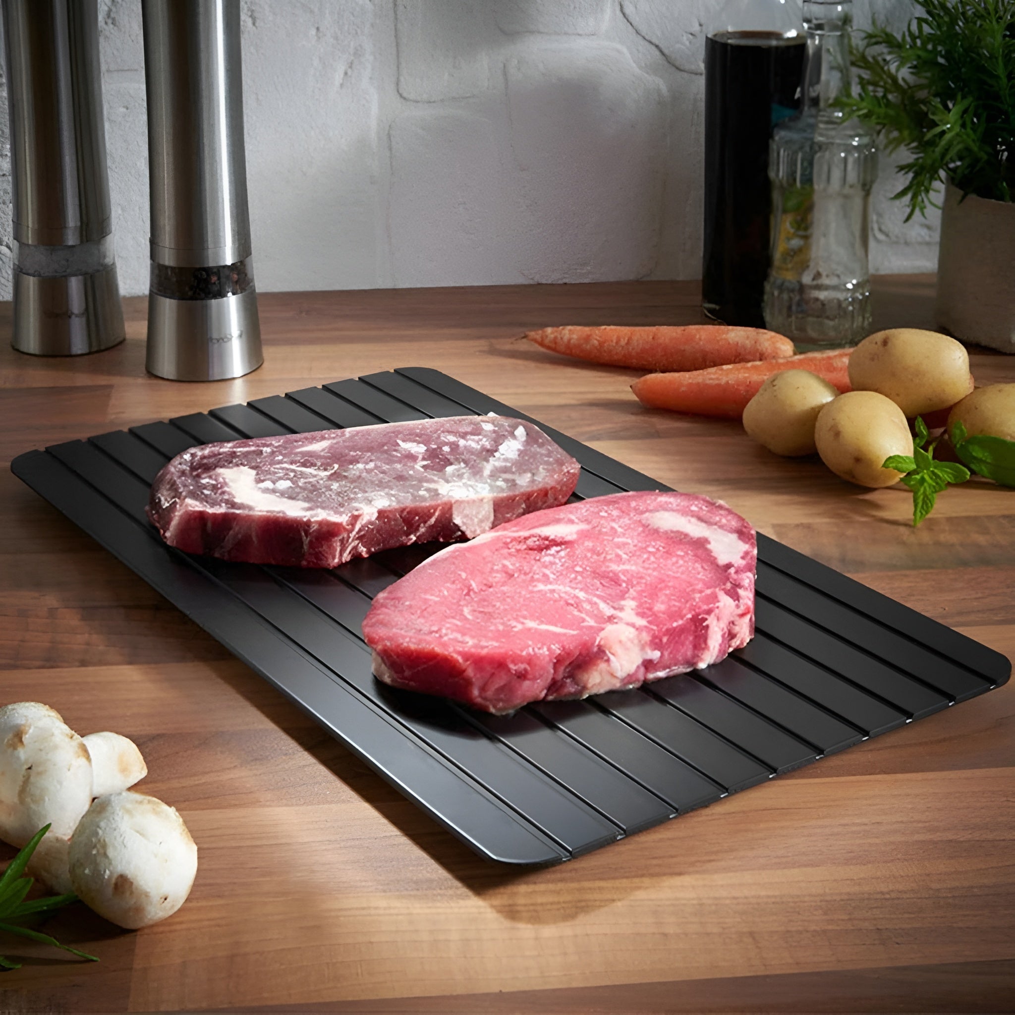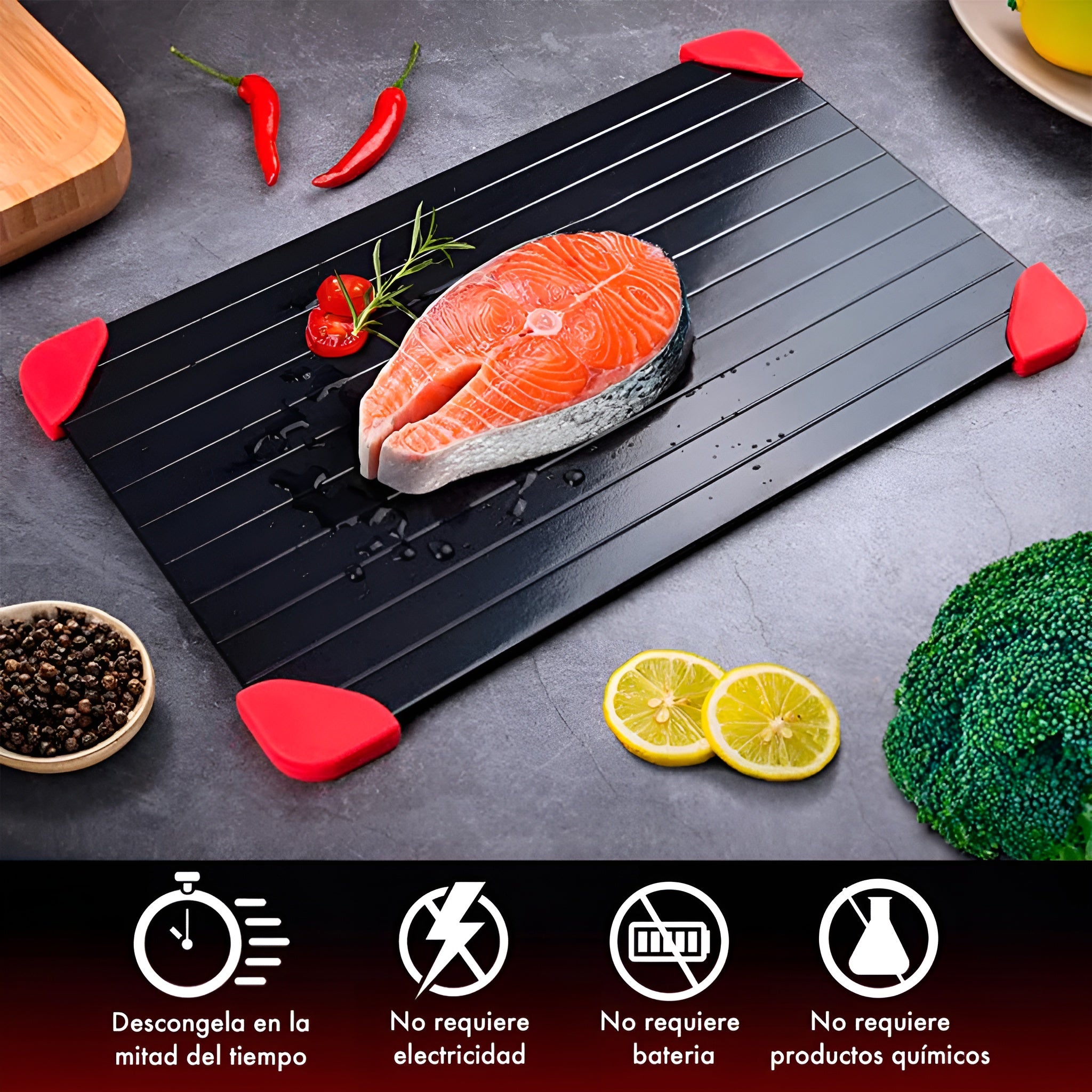 Fabricada en aluminio conductor térmico de alta calidad, esta bandeja acelera el proceso de descongelación hasta 8 veces más rápido que el método tradicional. Solo coloca tus alimentos congelados sobre la superficie y observa cómo recuperan su temperatura natural sin necesidad de electricidad, agua caliente ni microondas.