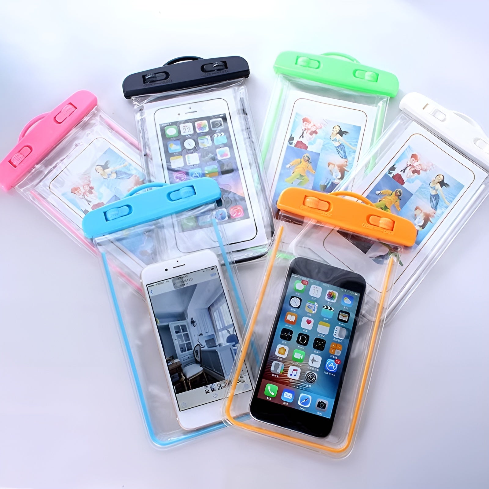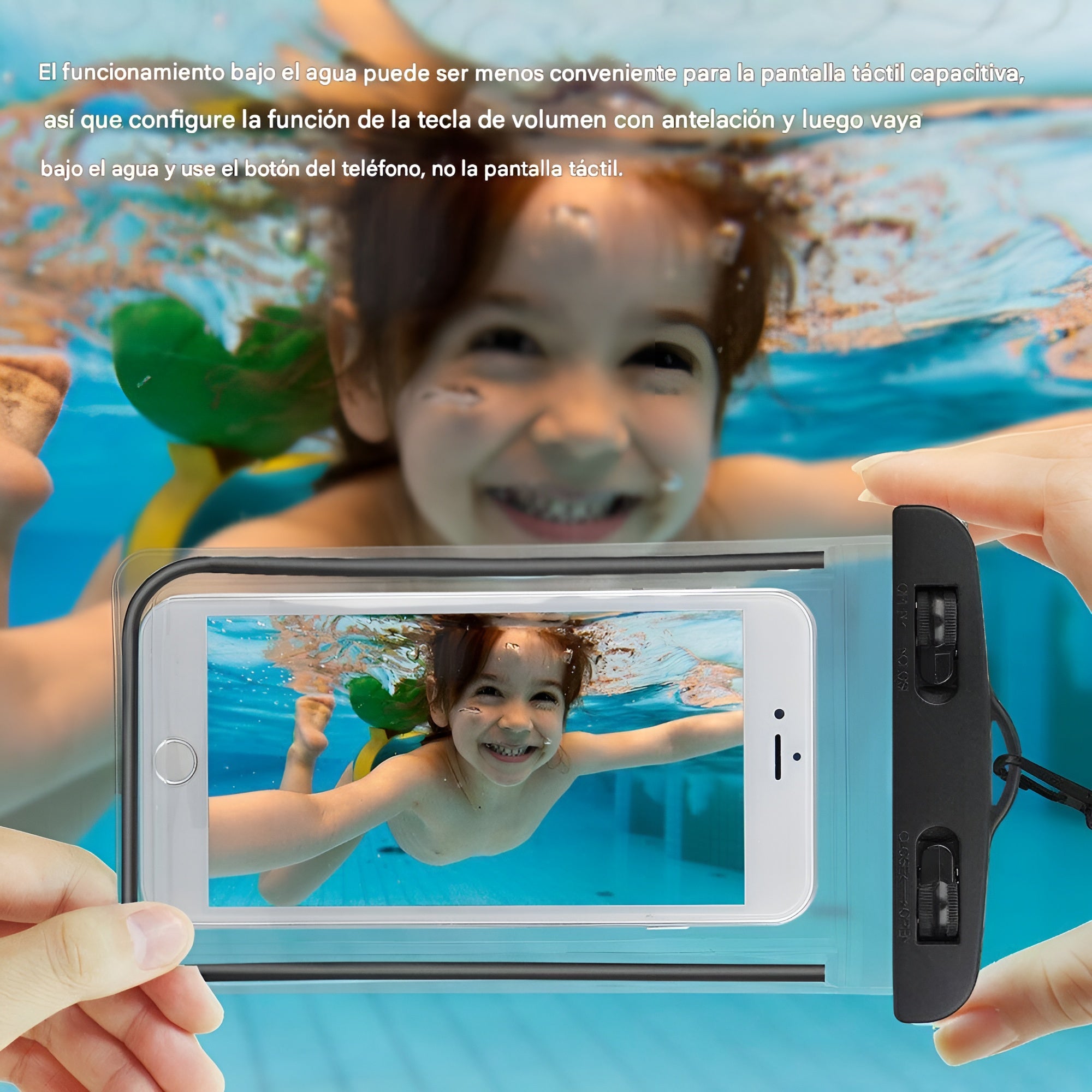 Su diseño transparente permite utilizar todas las funciones del teléfono sin necesidad de sacarlo de la bolsa: pantalla táctil, cámara y botones, todo al alcance de tu mano. El cierre hermético garantiza una protección total contra el agua y los elementos externos.