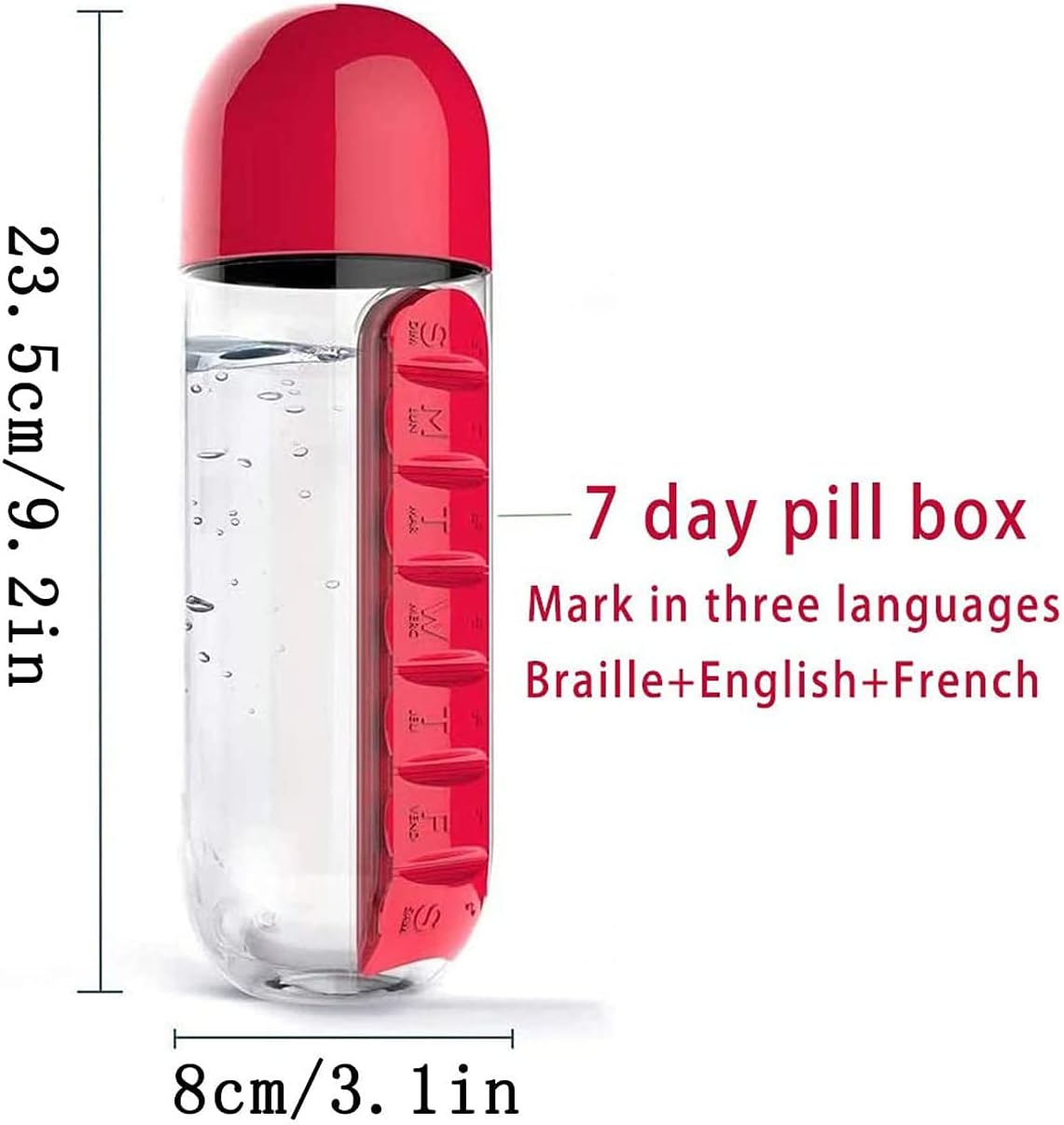 La Botella de Agua de 600 ml con Pastillero es un producto versátil y útil para aquellos que necesitan llevar sus medicamentos y agua de forma conveniente. Con su capacidad de 600 ml, el producto ofrece suficiente espacio para almacenar líquidos, mientras que el pastillero integrado en la tapa le permite organizar sus medicamentos de manera ordenada y accesible. Ya sea que esté de viaje o simplemente en su rutina diaria, esta botella de agua y pastillero combinados simplificarán su vida y le proporcionarán una solución práctica para mantenerse hidratado y asegurar la toma de medicamentos correcta y oportuna.