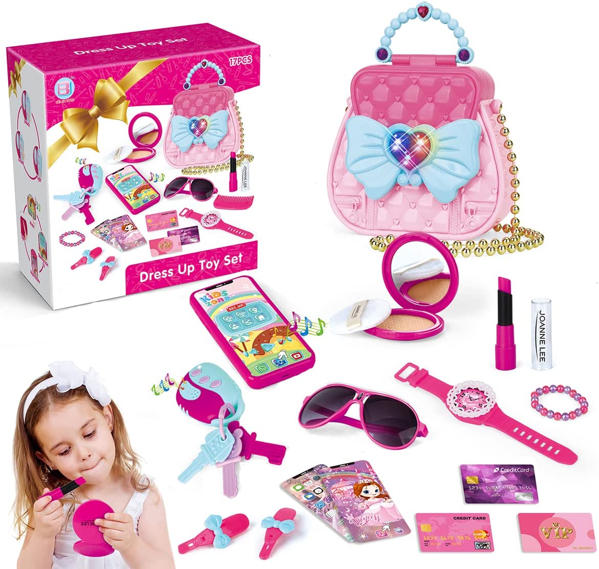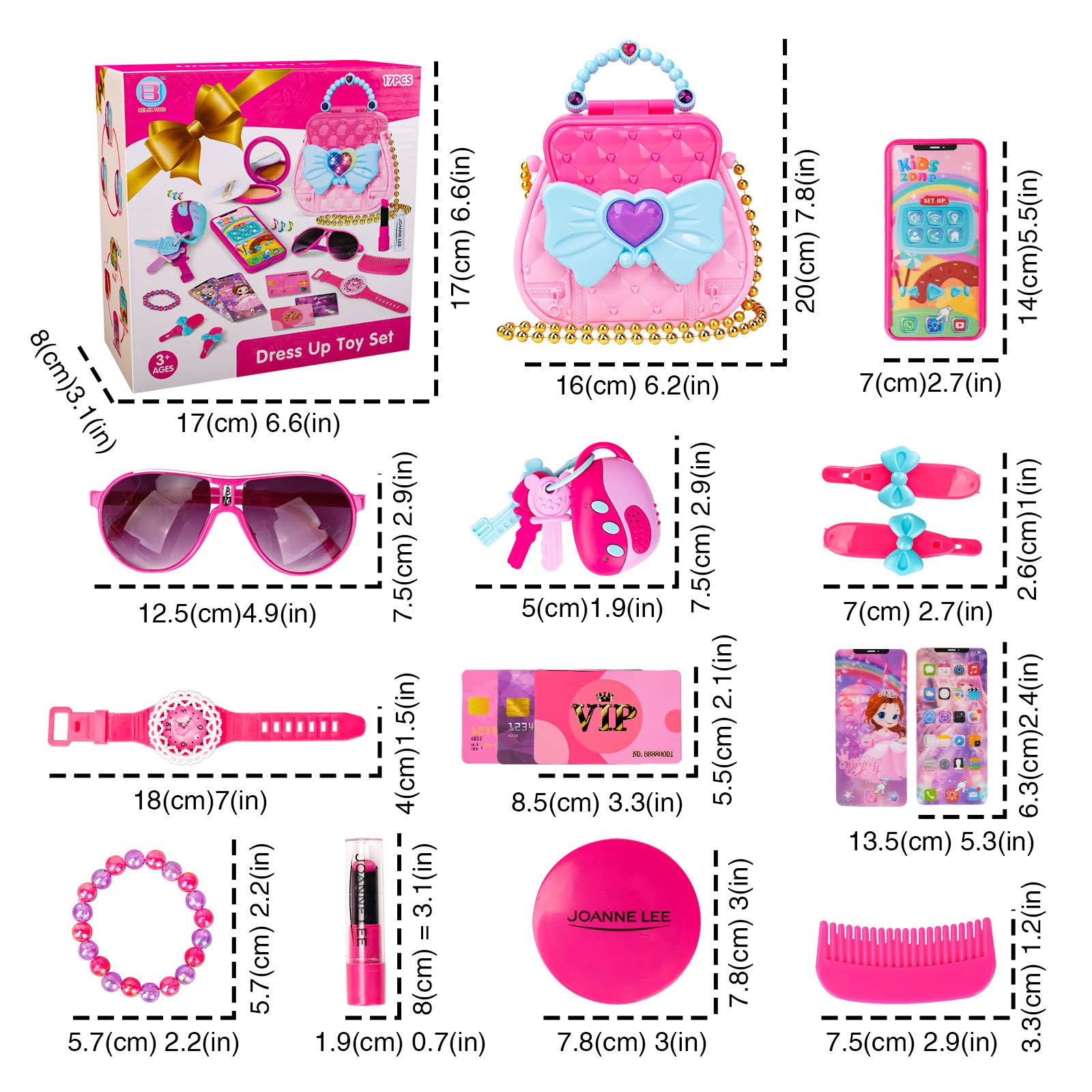 • Juego de disfraces y juegos de simulación: Los bolsos tienen todo lo que la niña necesita cuando sale. Incluye un teléfono móvil falso, gafas de sol, sombra de ojos falsa, prensado falso, peine, llave de coche falsa, tarjeta VIP y 2 tarjetas de crédito. En total 17 piezas incluye el producto.