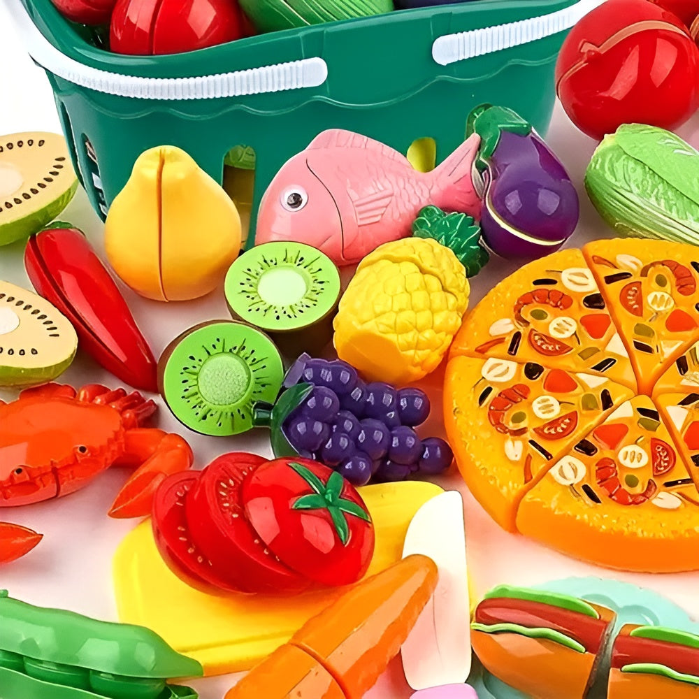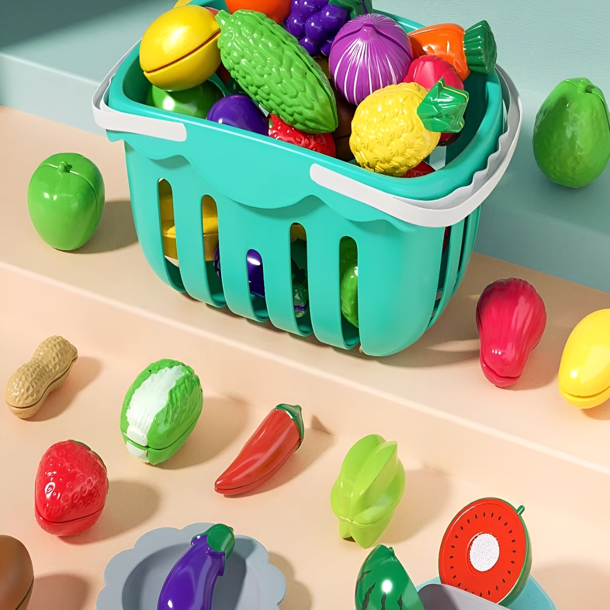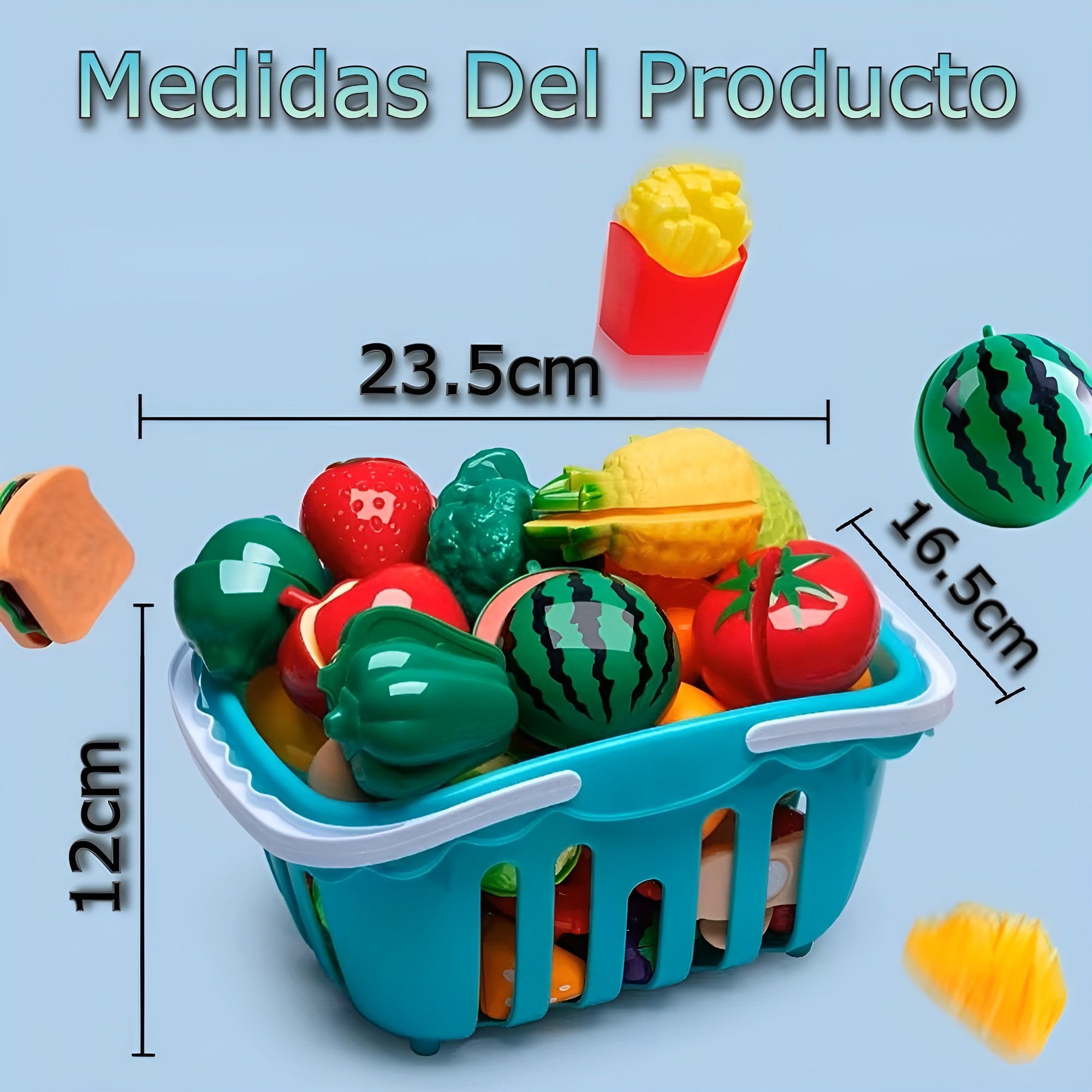 Incluye 24 piezas diferentes, desde una jugosa sandía y una dulce fresa hasta una crujiente zanahoria y la exótica fruta del dragón. Cada alimento está pensado para que los pequeños exploren texturas, colores y formas, creando comidas imaginarias llenas de creatividad.