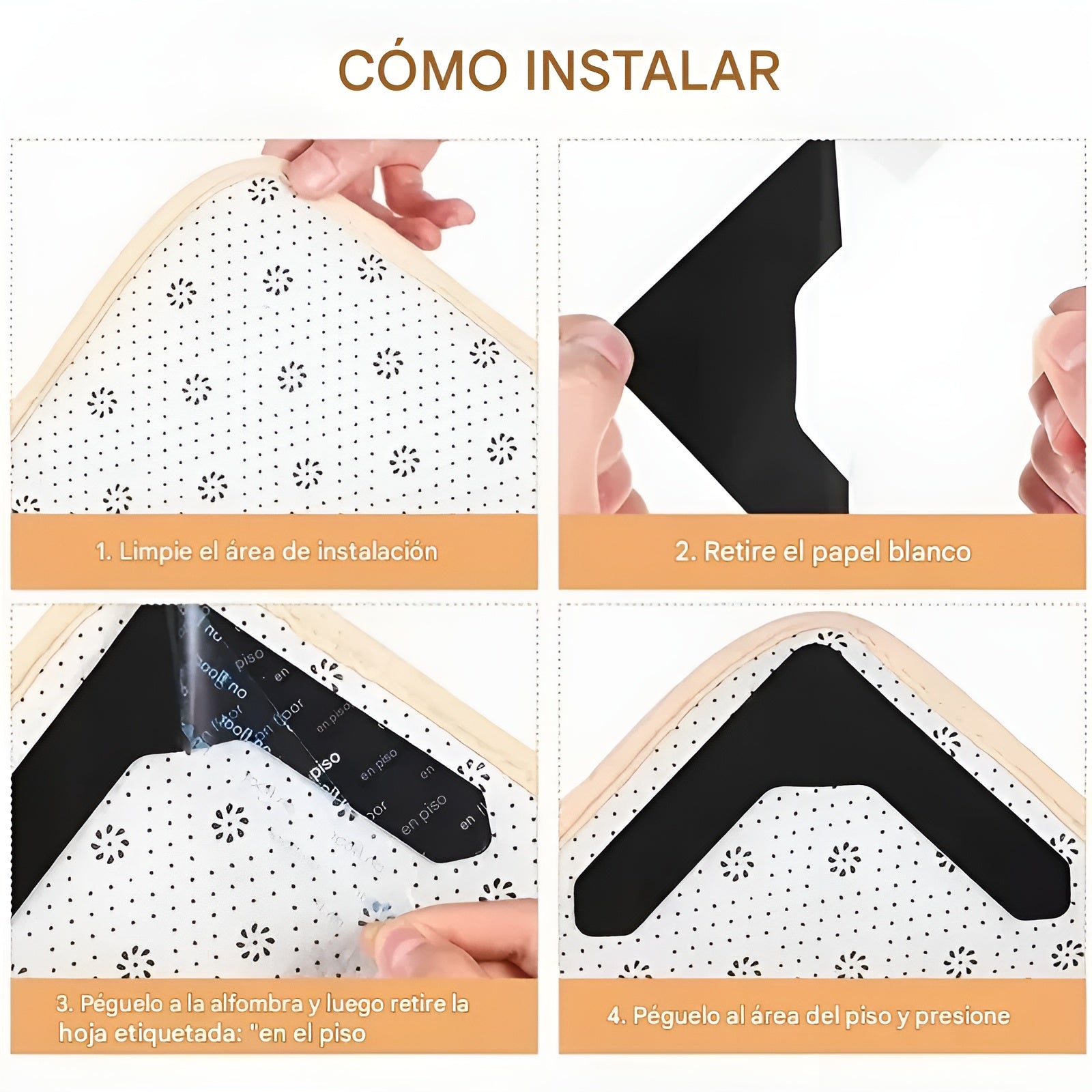 Este set incluye 4 piezas, ideales para múltiples alfombras en la cocina, baño, pasillo o sala. También funciona perfectamente en alfombras redondas, manteniéndolas en su lugar y haciendo tu hogar mucho más seguro y cómodo.