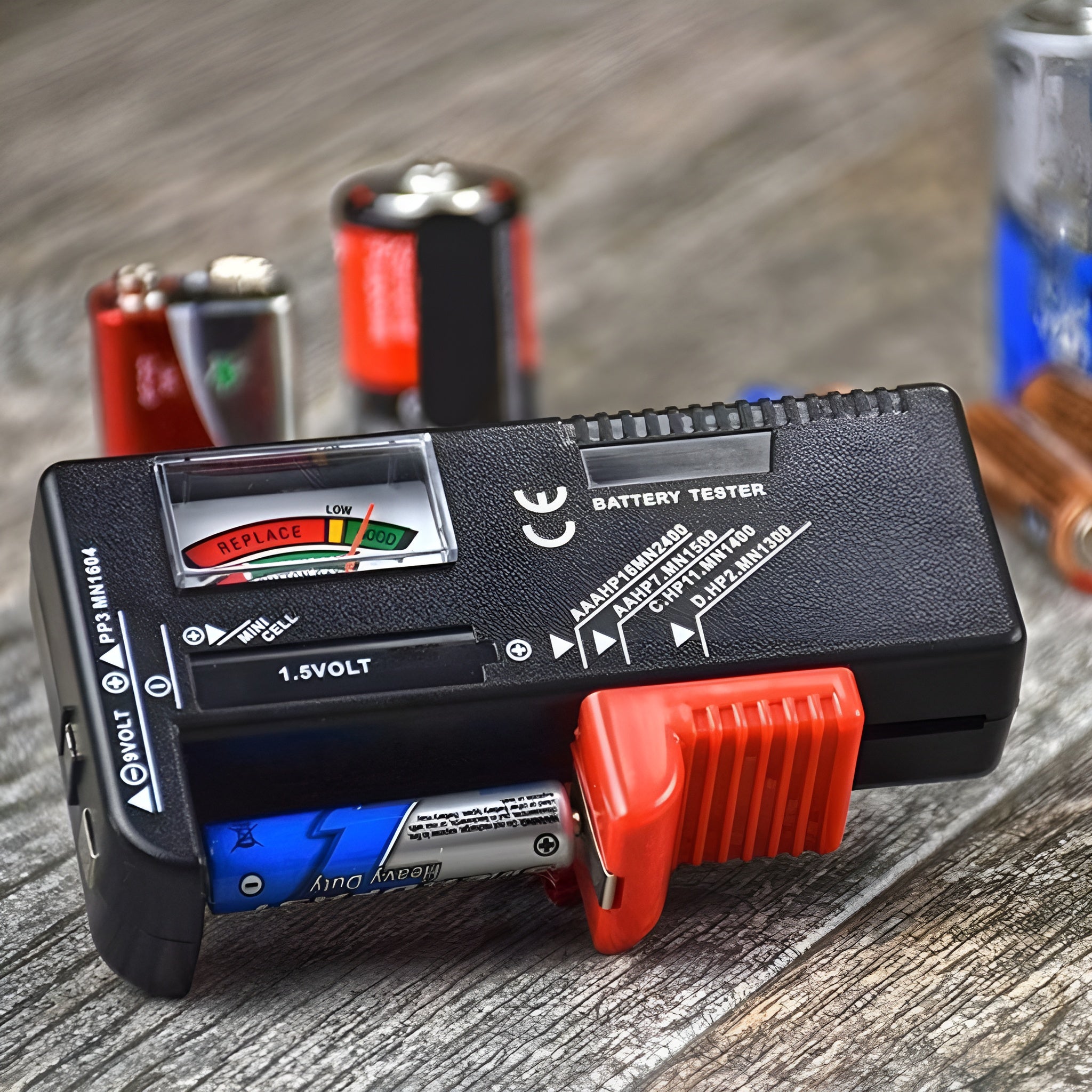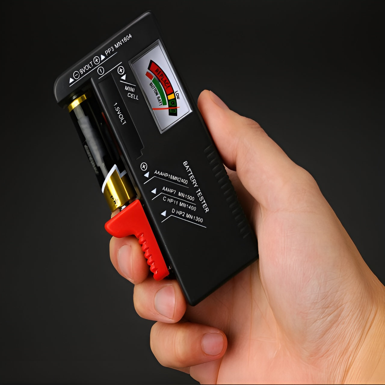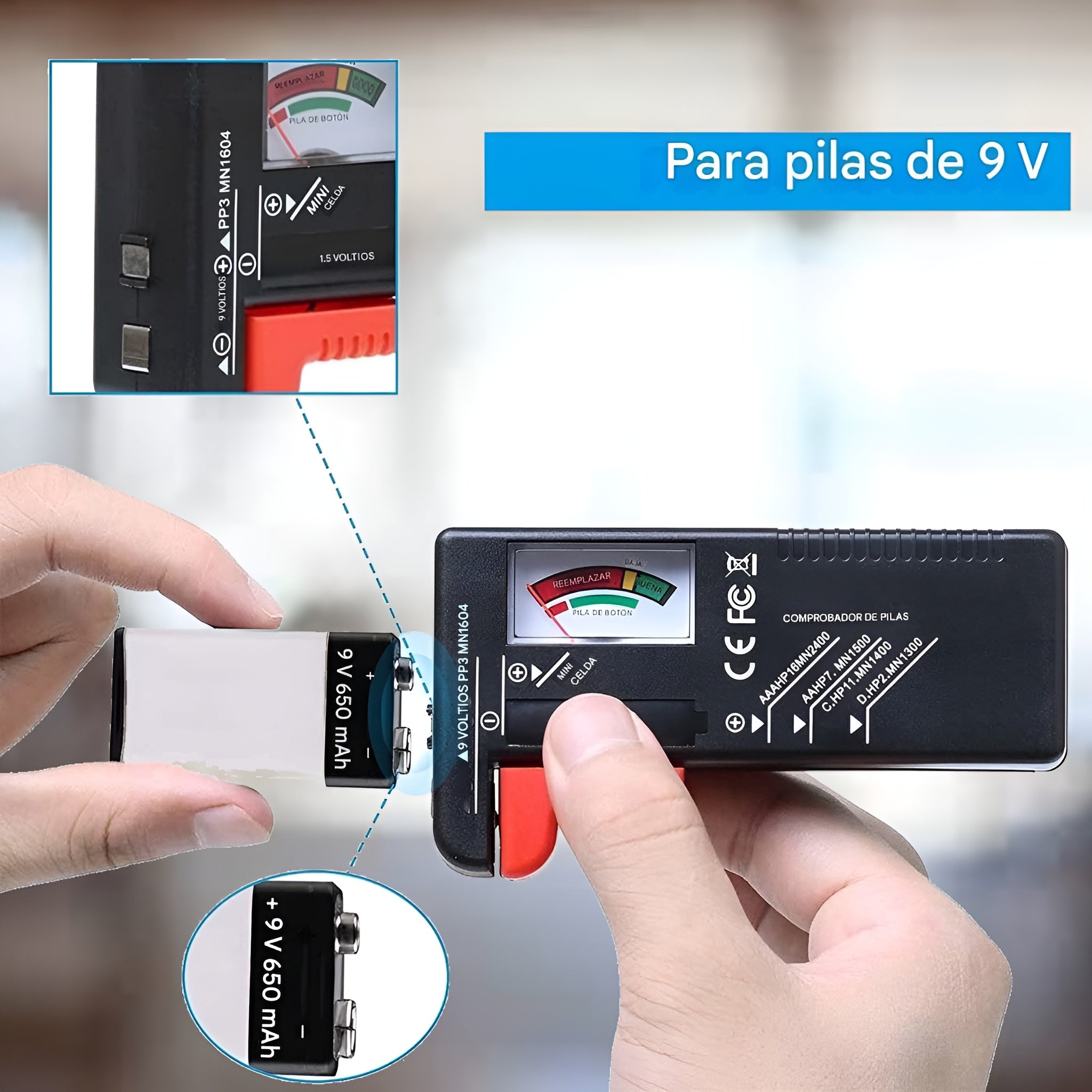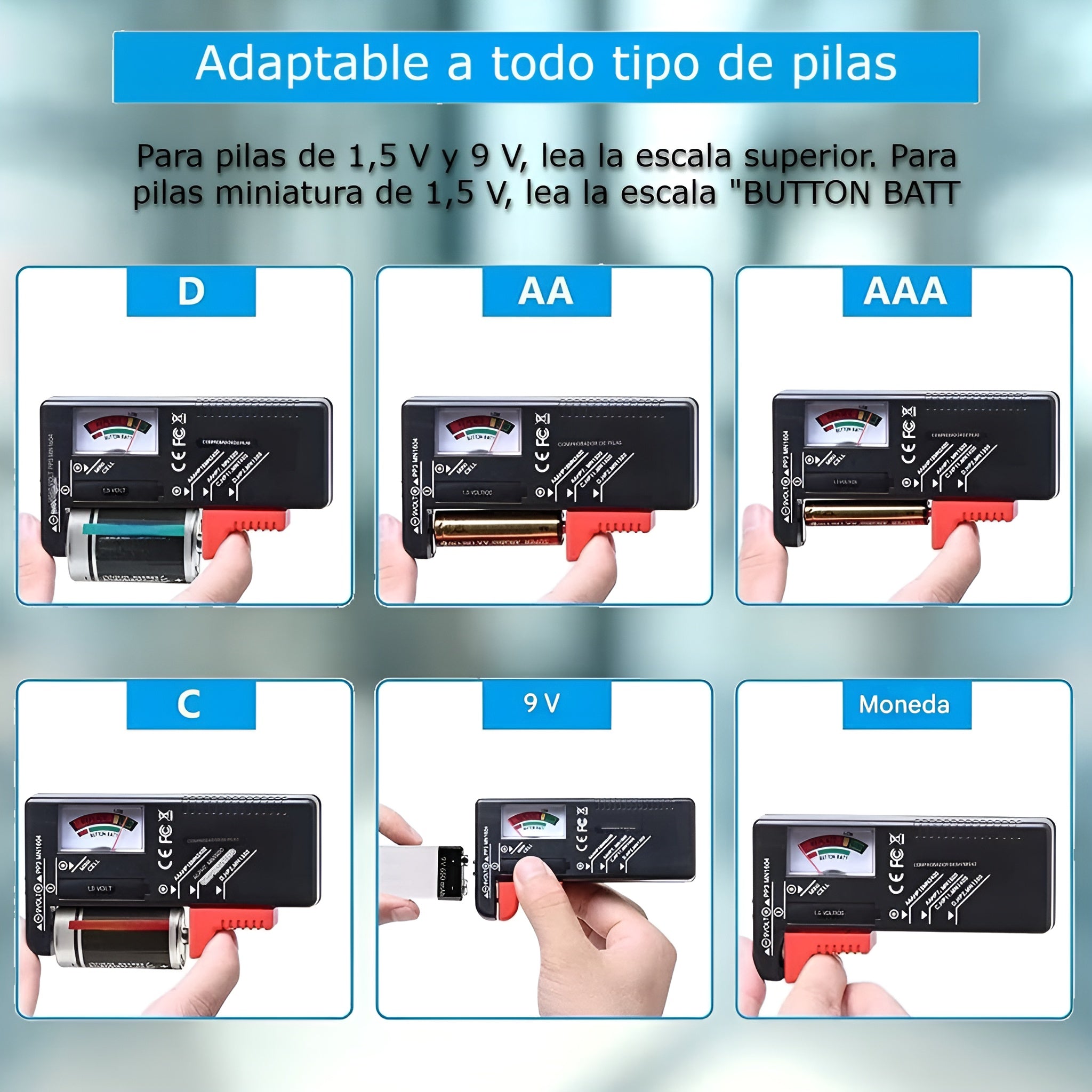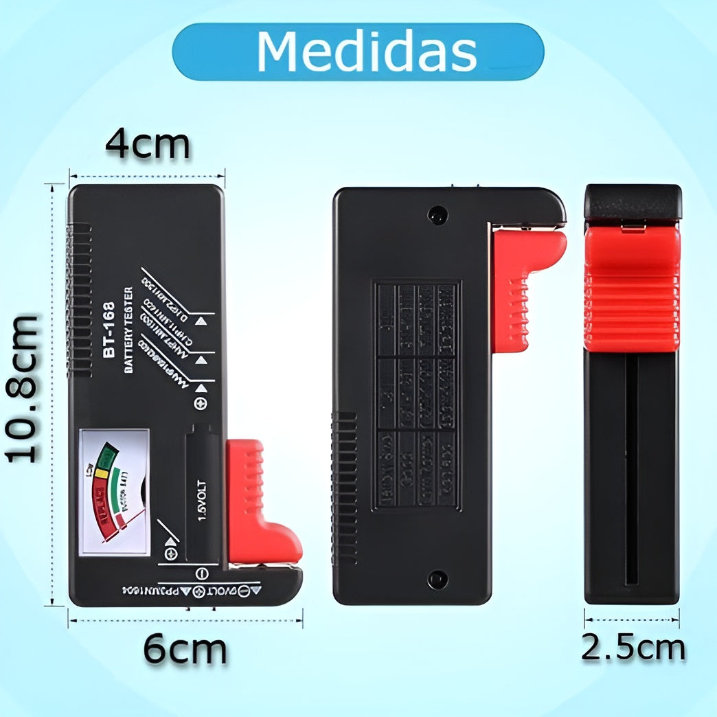 Compatible con una amplia variedad de formatos, funciona con pilas AAA, AA, C, D, 9V y también con baterías tipo botón. Su sistema incorpora dos puntos de contacto que permiten medir tanto baterías de 1,5 V como de 9 V, ofreciendo una versatilidad ideal para el hogar, la oficina o el taller.