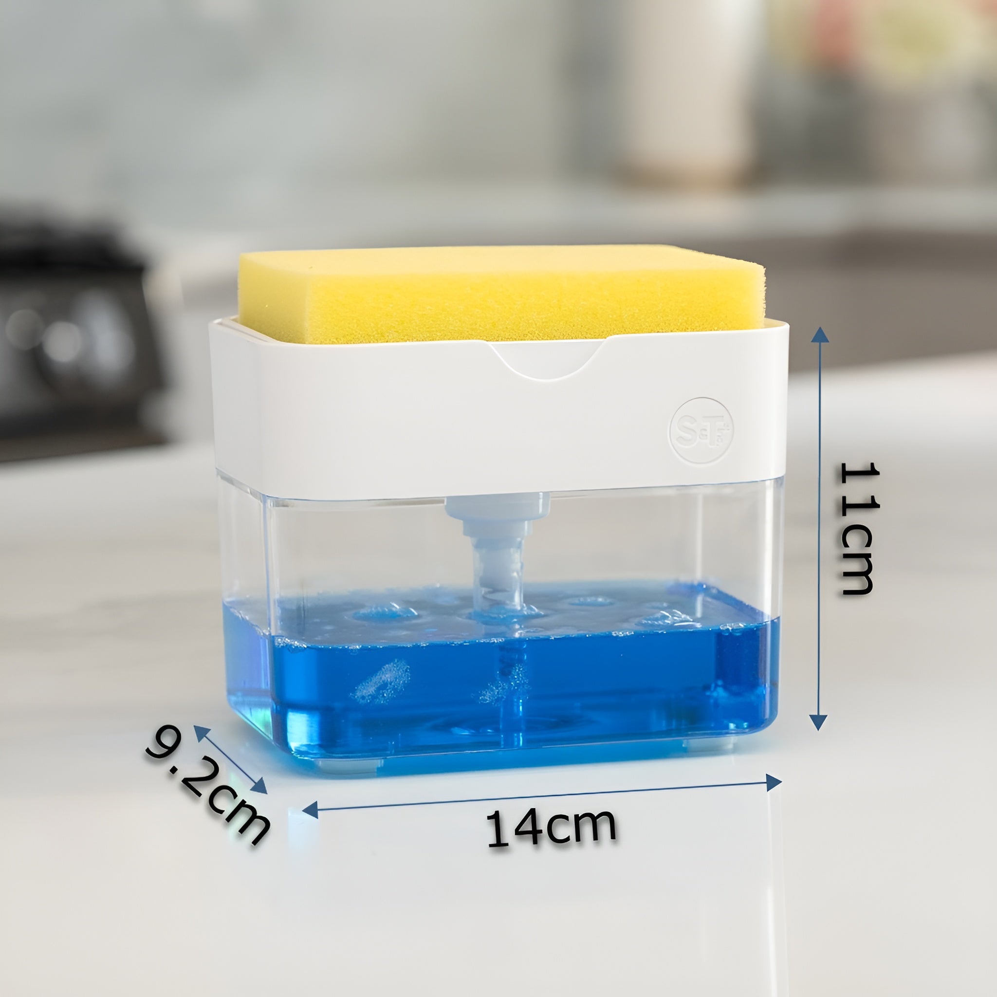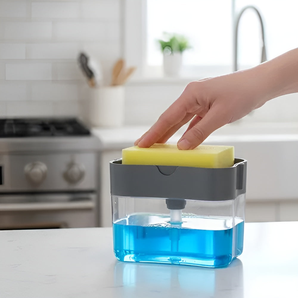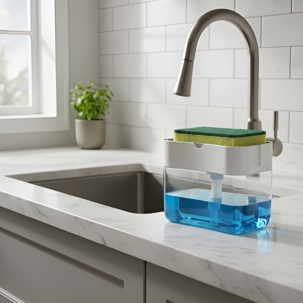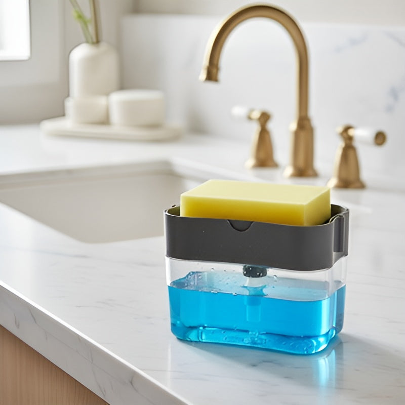 Este dispensador no solo organiza tu espacio, sino que también aporta comodidad y eficiencia al momento de lavar los platos. Con él, olvídate de las botellas desordenadas y las esponjas extraviadas: tendrás todo lo necesario en un solo lugar, con un diseño moderno que realza tu cocina.