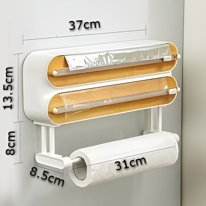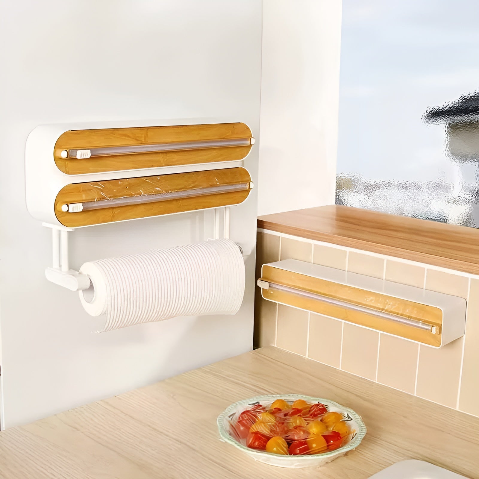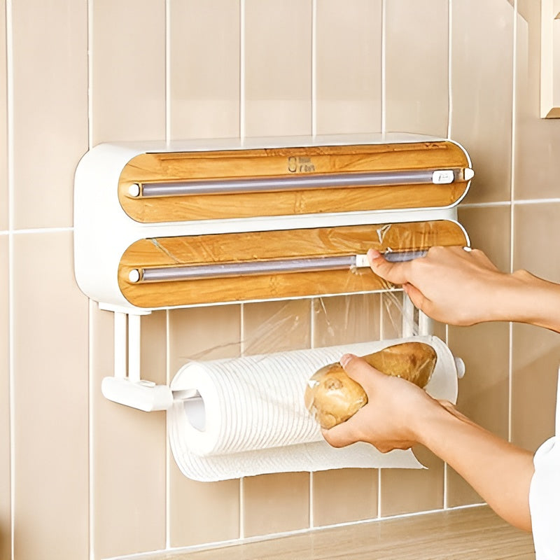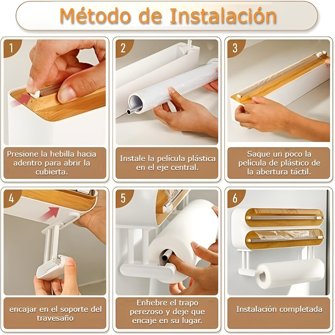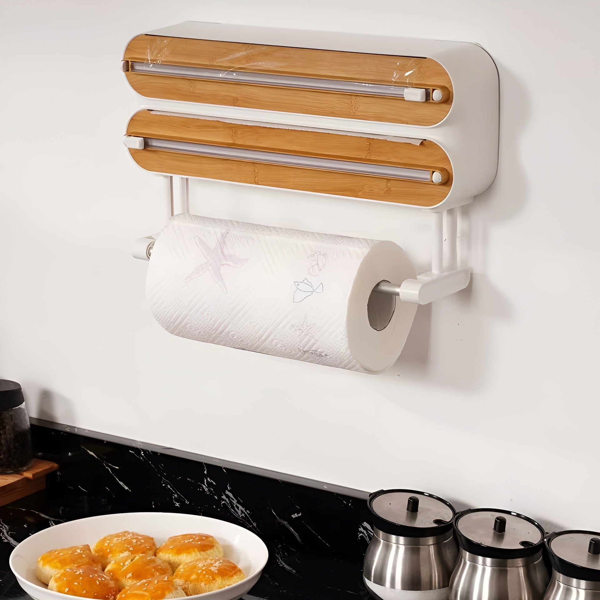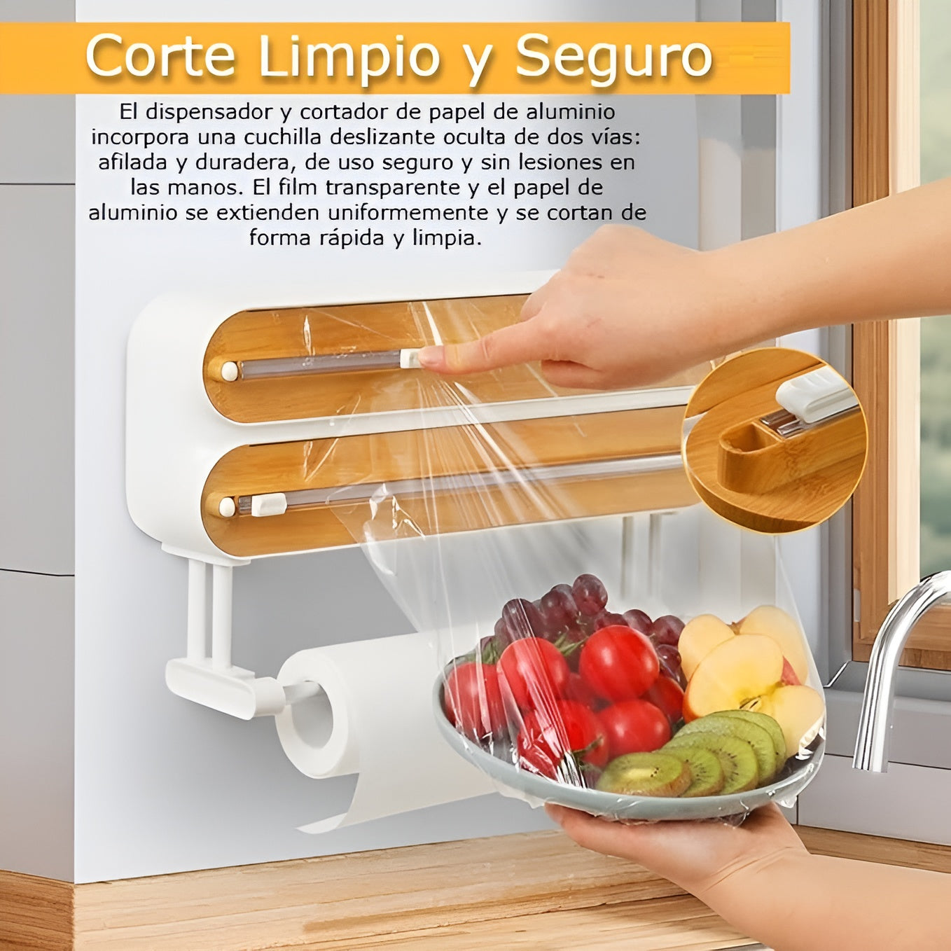 Este modelo incluye un portarrollos 3 en 1 que te permite montar papel de cocina, papel aluminio y film transparente en un solo dispositivo. Ideal para ahorrar espacio en la encimera y tener todo al alcance de la mano.