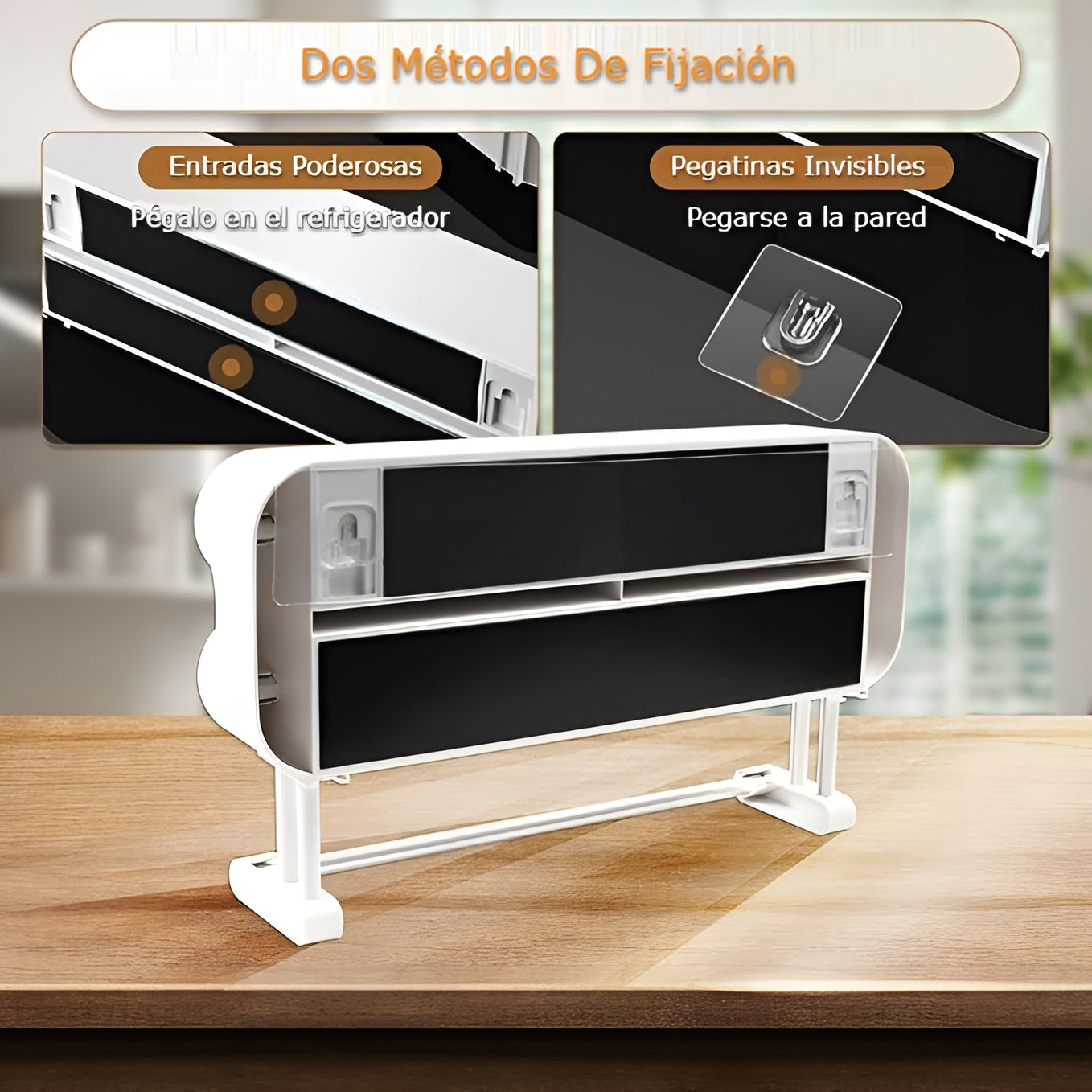 La base cuenta con un imán potente que se adhiere fácilmente a superficies metálicas como el refrigerador, y también incorpora ganchos adhesivos para colocar en la pared o encimera. Tú decides cómo instalarlo según tu espacio.