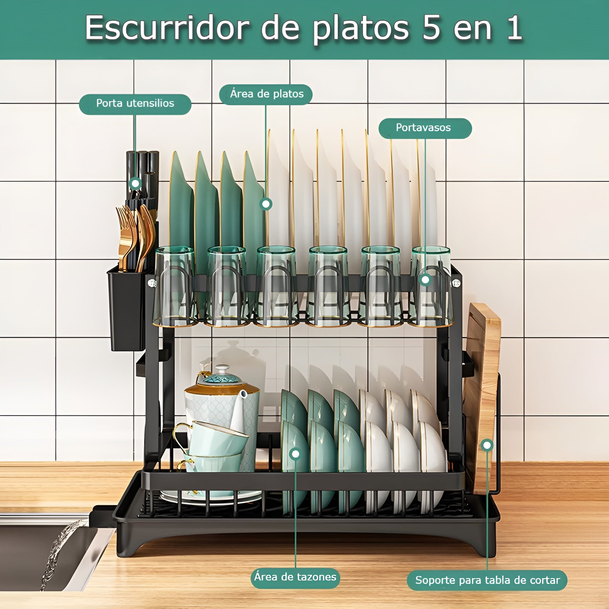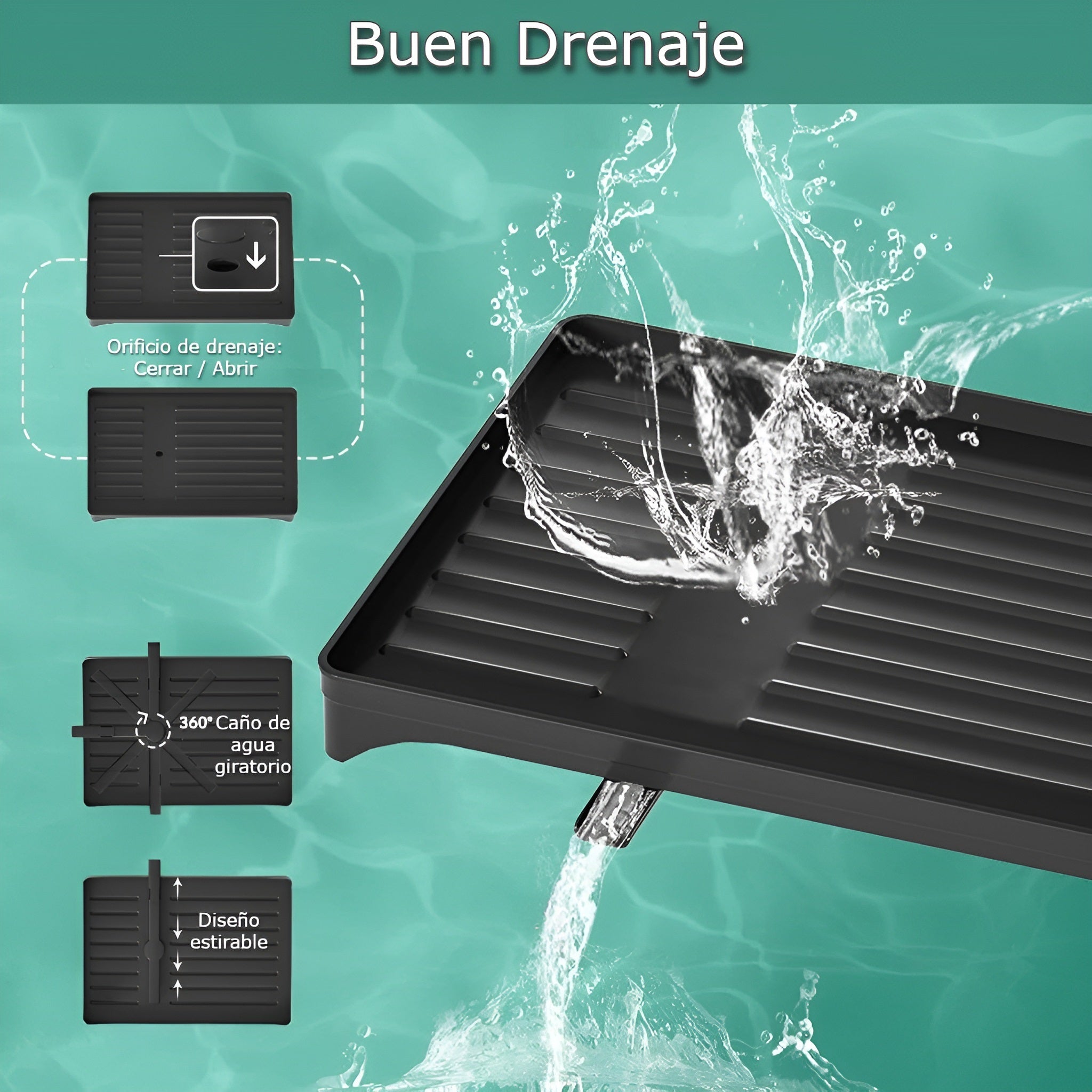 Diseñado para familias de 3 a 4 personas, este escurridor incluye soporte para cuchillos y utensilios, portavasos, soporte para tabla de cortar y un escurridor inferior que mantiene todo en su lugar. Su sistema de drenaje automático con boquilla giratoria de 360° dirige el agua directamente al fregadero, evitando charcos y manteniendo la cocina seca y limpia.