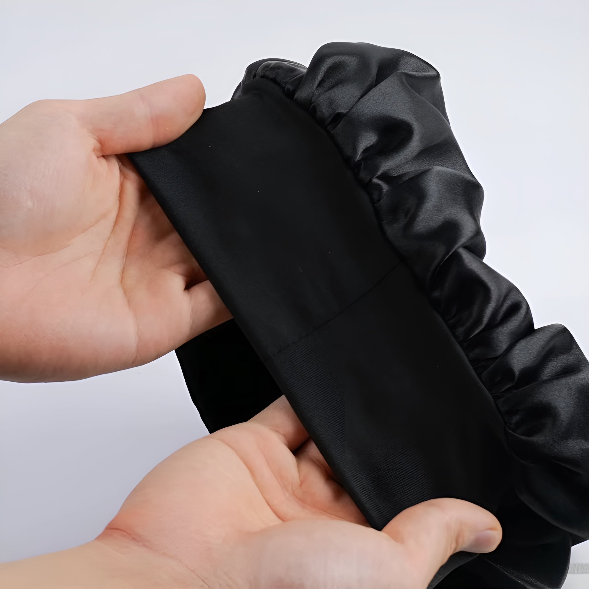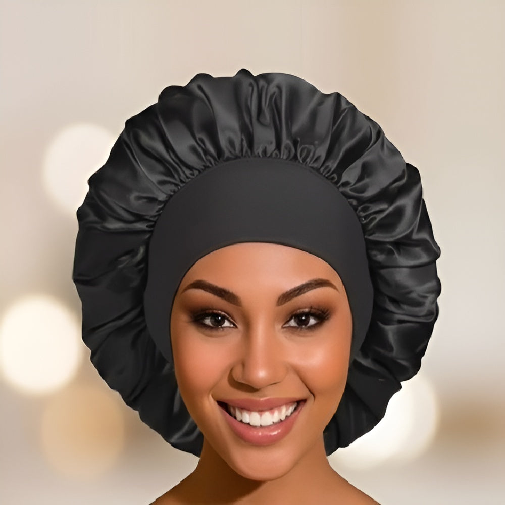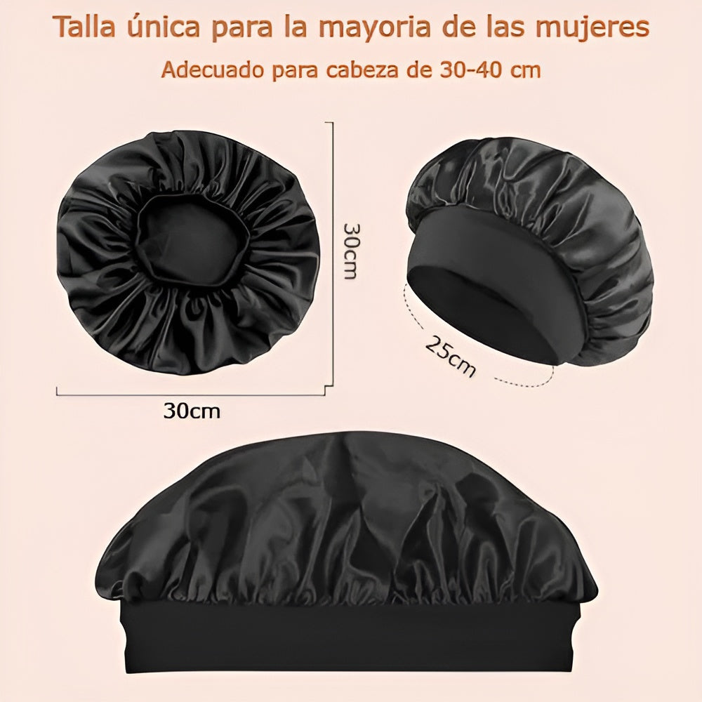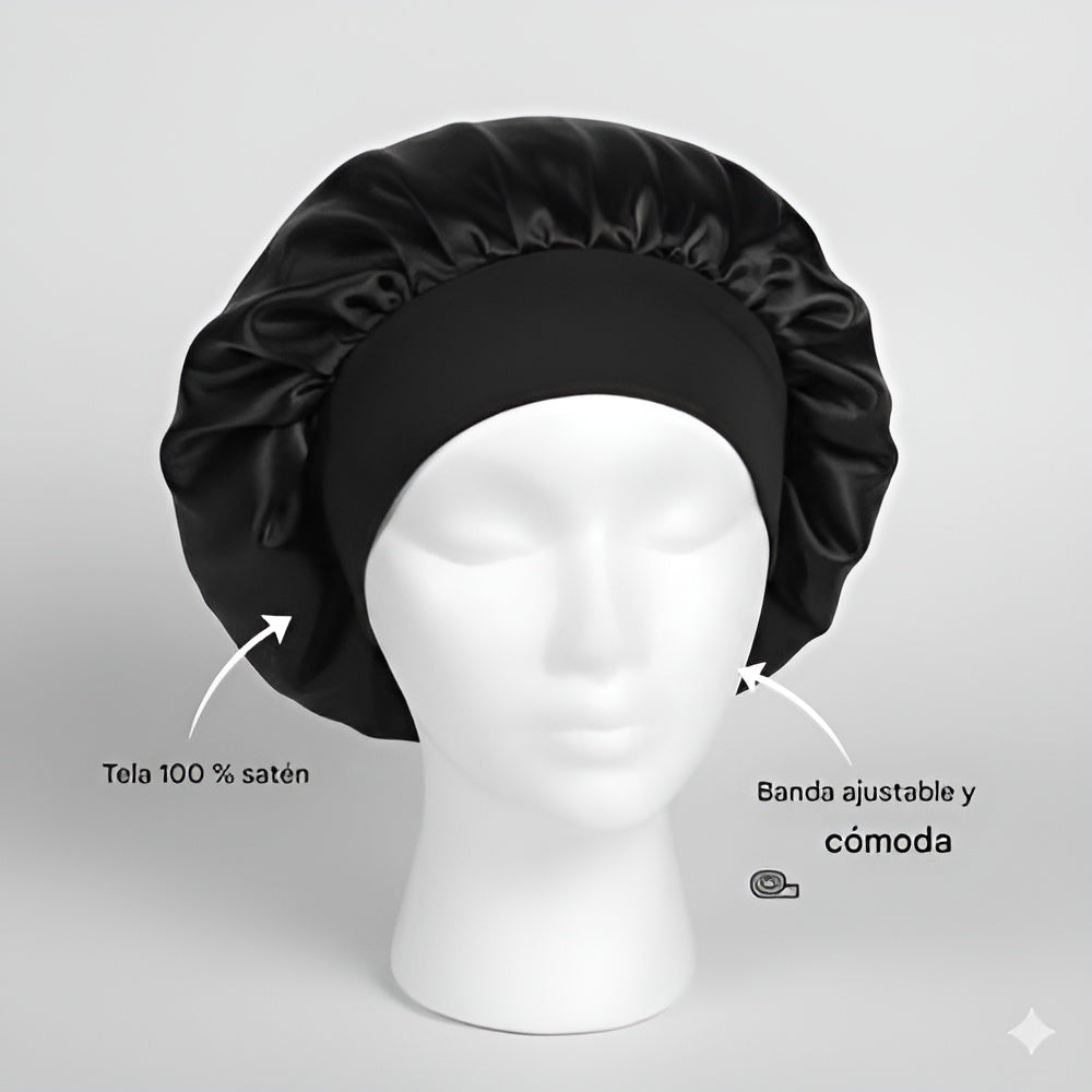 Confeccionado en satén sedoso, suave y transpirable, ayuda a conservar la humedad del cabello y reduce la fricción. La banda larga de elastano elástico ofrece un ajuste cómodo sin apretar ni dejar marcas, superando ampliamente a las bandas elásticas tradicionales. Es una opción más cómoda, más suave y mucho más amigable con tu cabello.