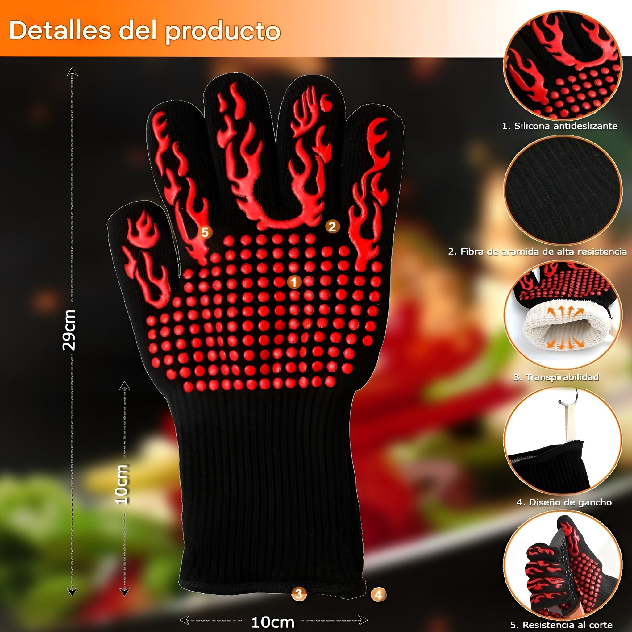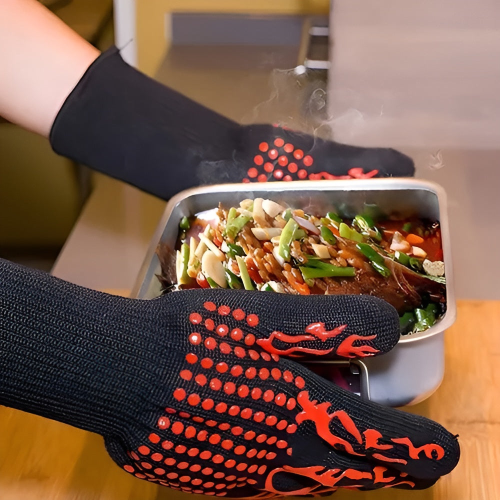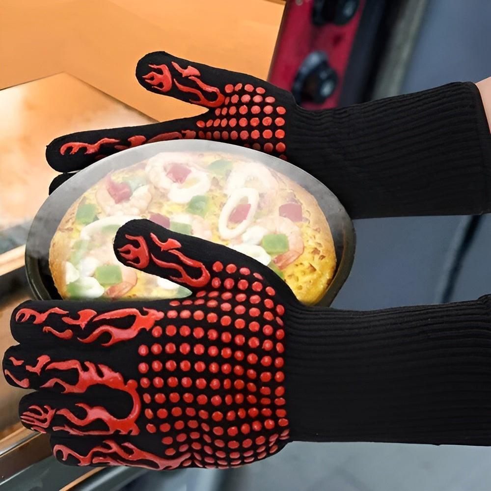 Los Guantes para altas temperaturas son la elección perfecta para quienes disfrutan cocinar con seguridad y estilo. Diseñados para soportar temperaturas extremas de hasta 800 °C, ofrecen un aislamiento térmico avanzado que protege tus manos contra quemaduras y accidentes mientras manipulas utensilios o parrillas calientes.