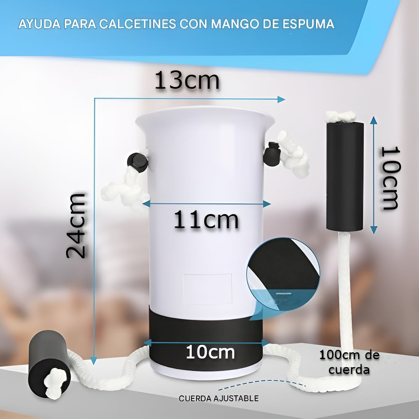 Incluye una ayuda para calcetines ajustable, fabricada con una carcasa fuerte pero flexible que se adapta a calcetines de todos los tamaños. Su forro antideslizante asegura que el calcetín permanezca en su lugar mientras se desliza suavemente sobre el talón y el tobillo. Además, el mango puede ajustarse en longitud mediante deslizadores de botón, ofreciendo un agarre cómodo gracias a sus asas de espuma suave.