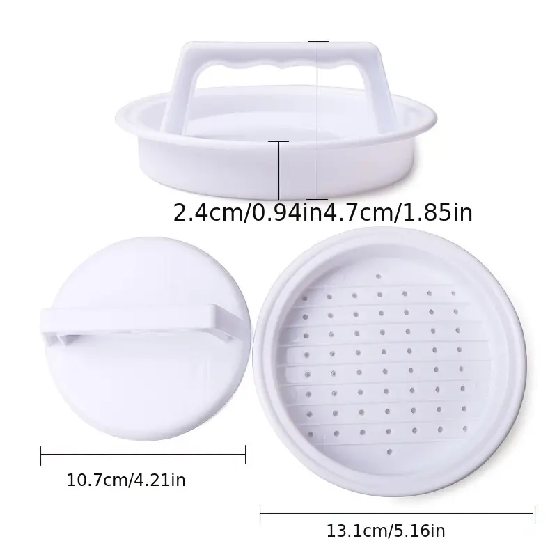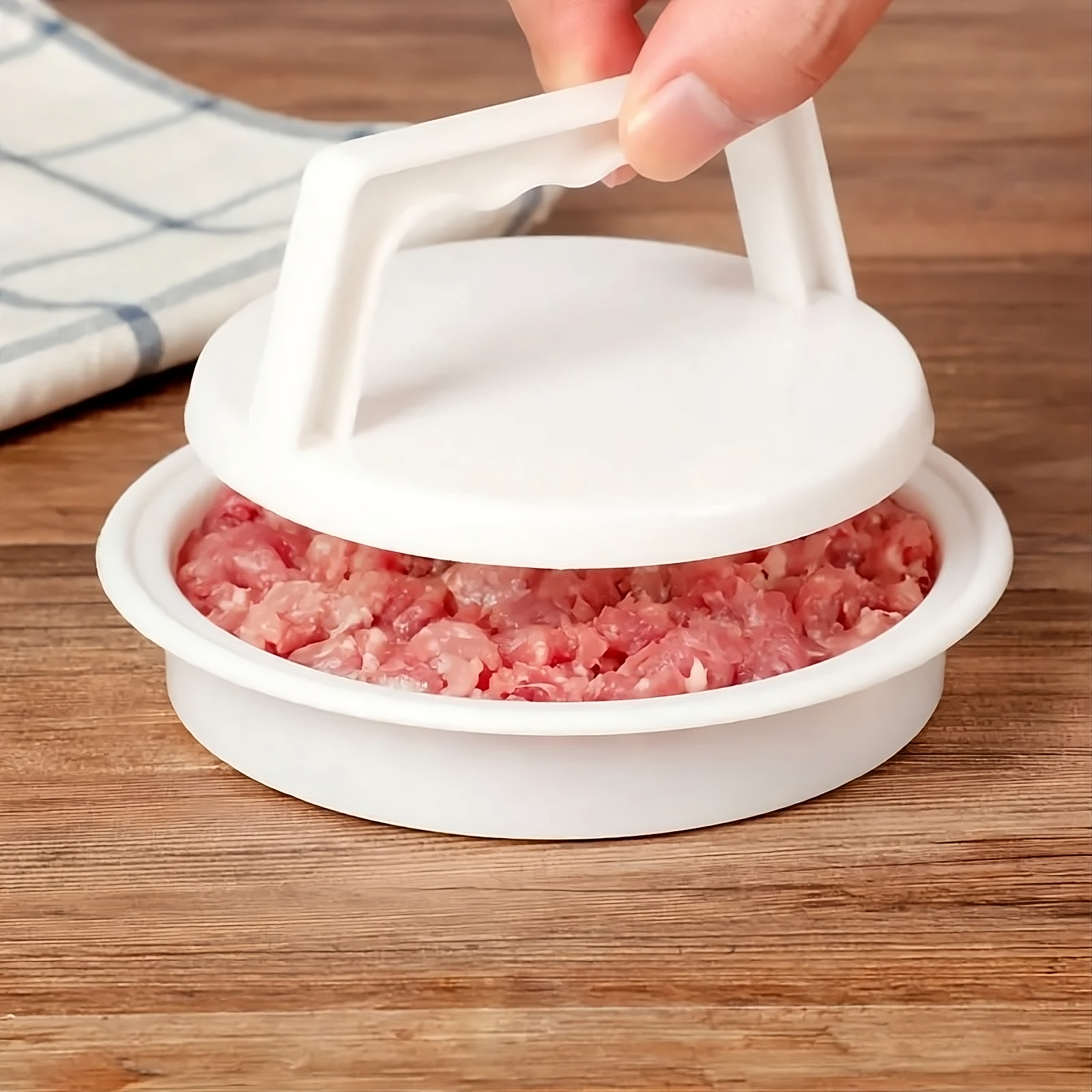La prensa de hamburguesas es redonda, blanca, de plástico de grado alimenticio, hamburguesas, carne, carne, parrilla, hamburguesas,...