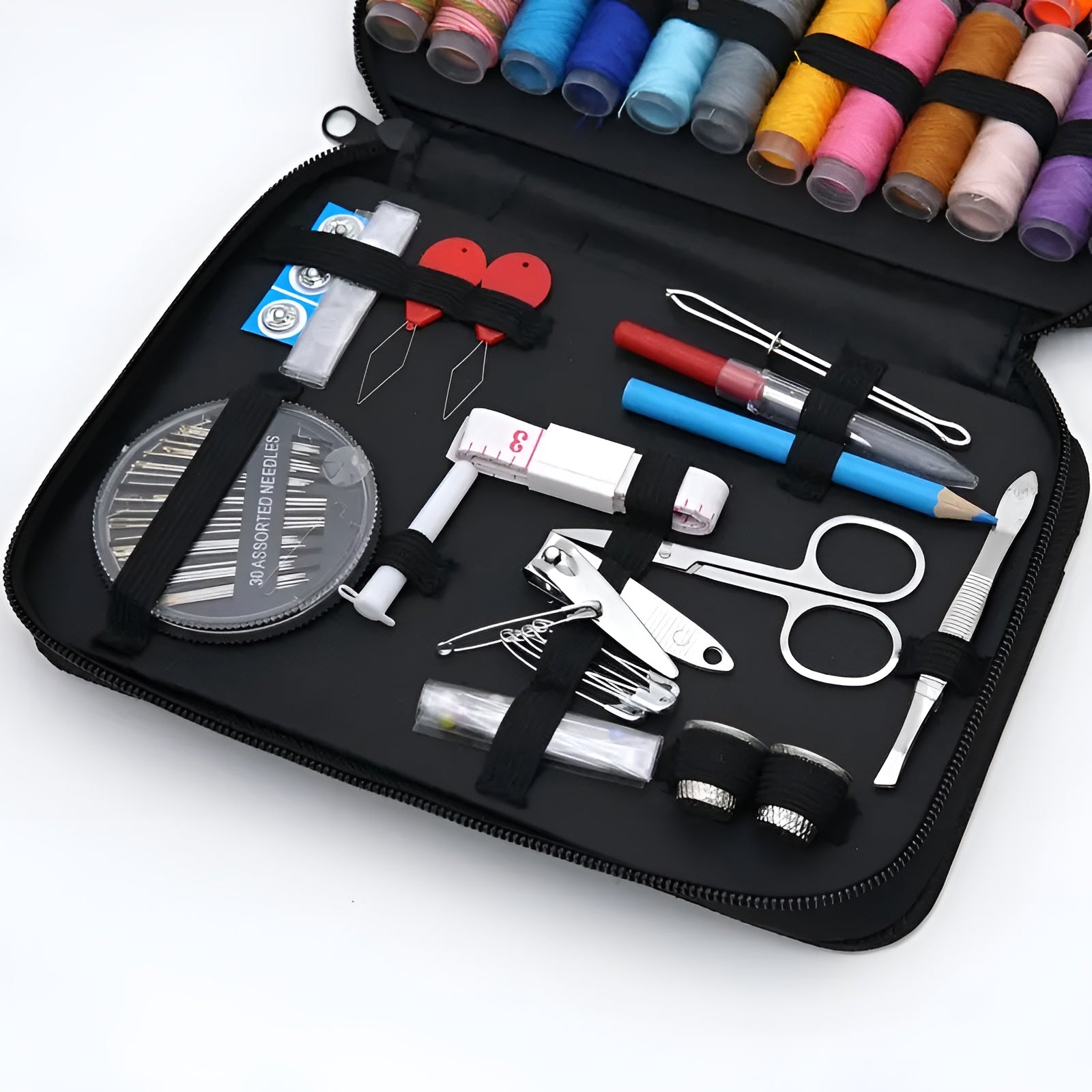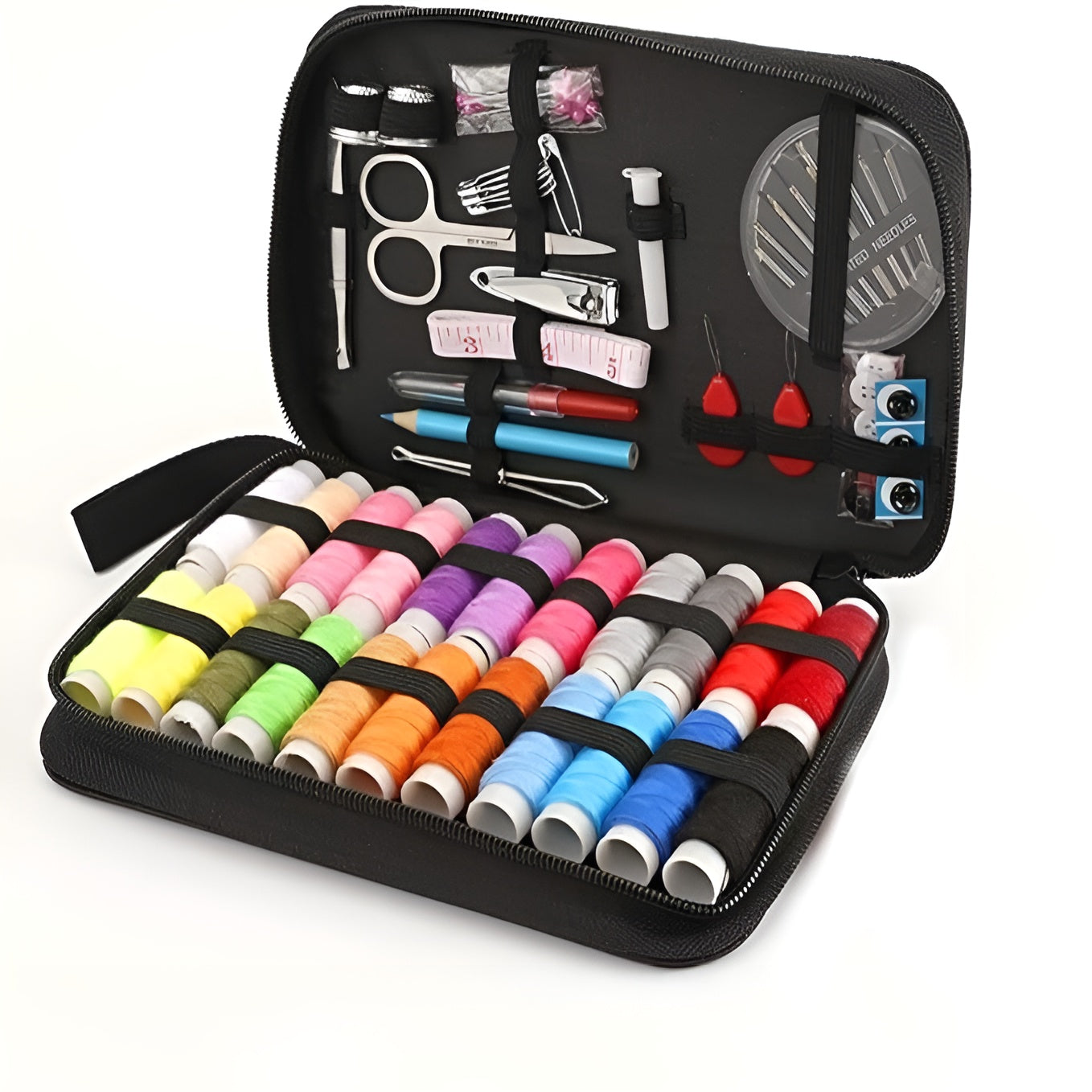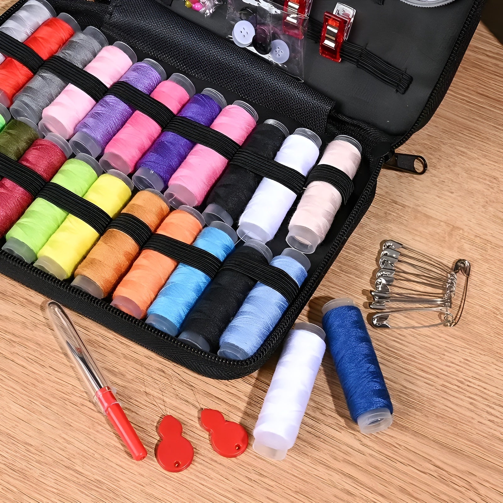 Incluye una selección completa de herramientas esenciales: agujas, hilos de 65 yardas, tijeras, botones, dedal, enhebra dores, desgarrador de costura y más. Todo organizado en un estuche ligero y funcional que maximiza el espacio sin sacrificar utilidad.