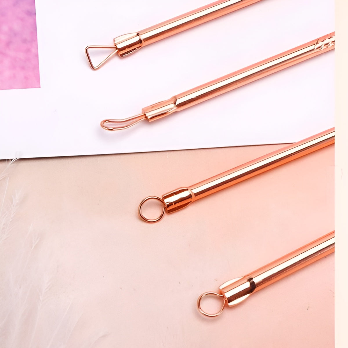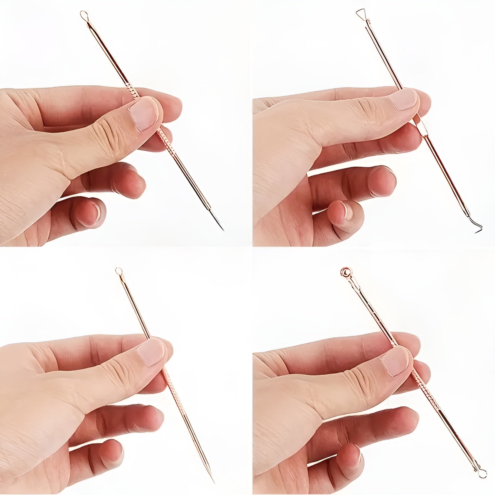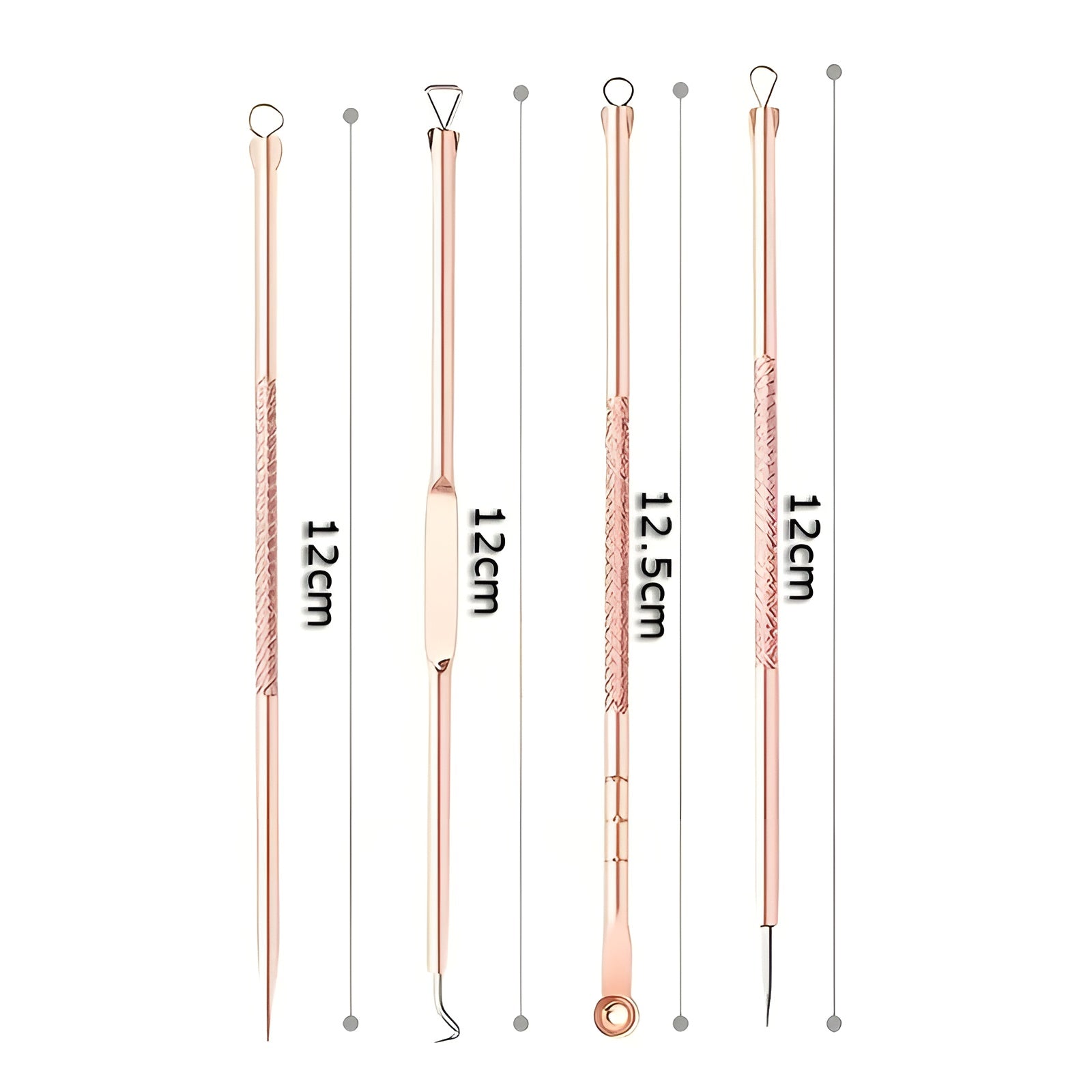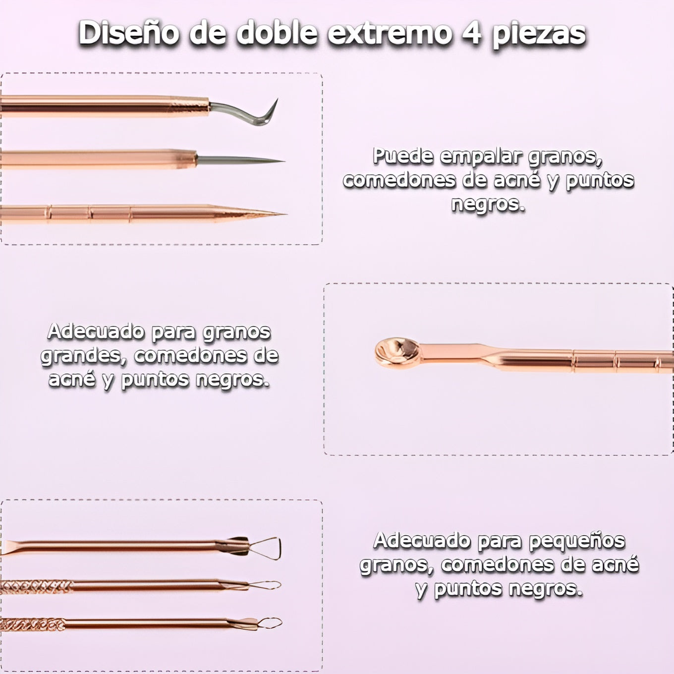 Incluye 4 herramientas de doble cabeza fabricadas en acero inoxidable de grado médico, resistentes, higiénicas y fáciles de limpiar. Cada pieza está diseñada para eliminar puntos negros, espinillas y otras obstrucciones sin dañar la piel ni dejar marcas.