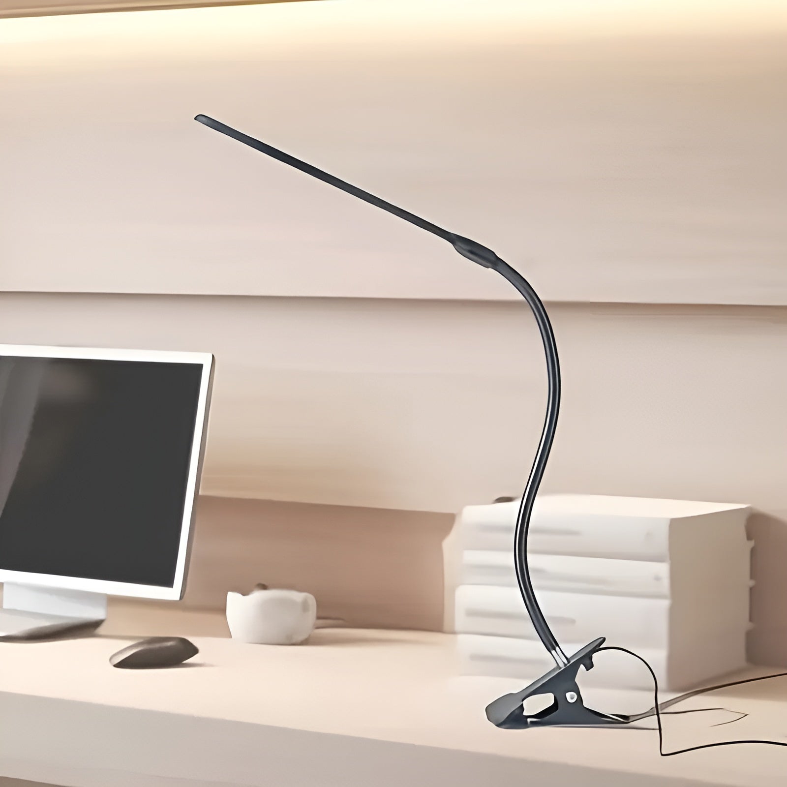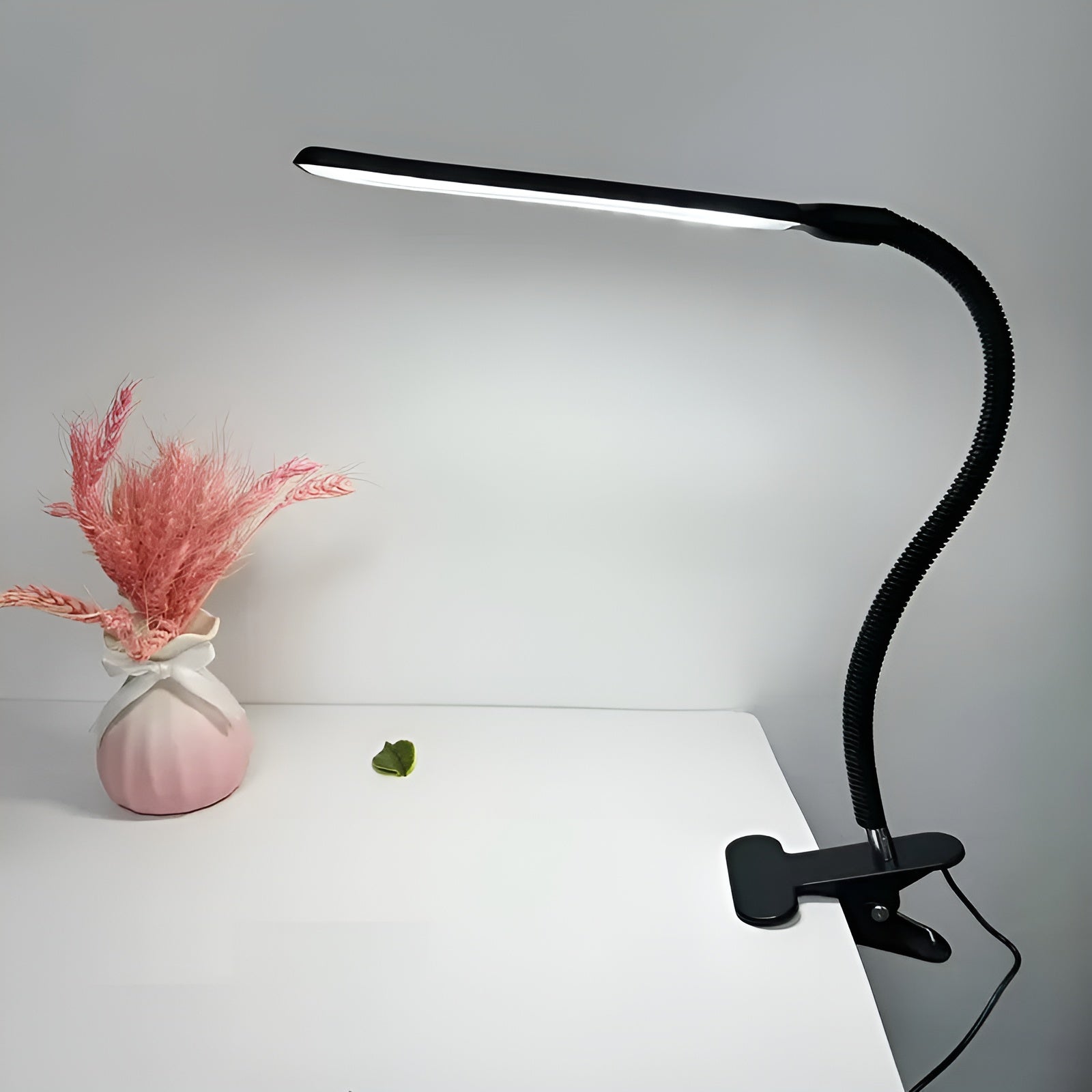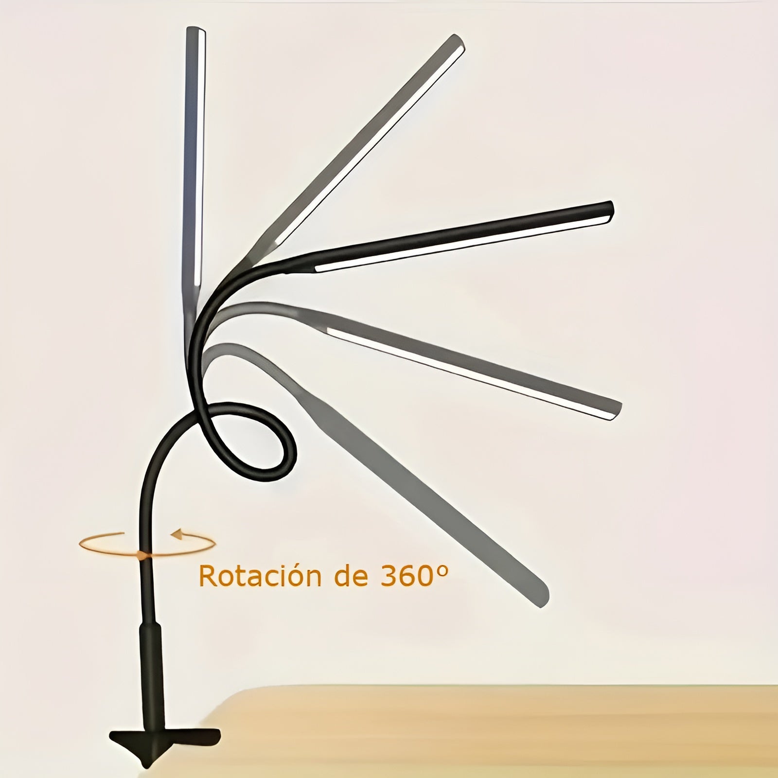 Su diseño portátil se adapta fácilmente a escritorios, mesas de noche o estanterías. El cuello flexible y la base tipo clip permiten ajustar la lámpara en un ángulo de 360°, asegurando la iluminación exacta donde la necesites.