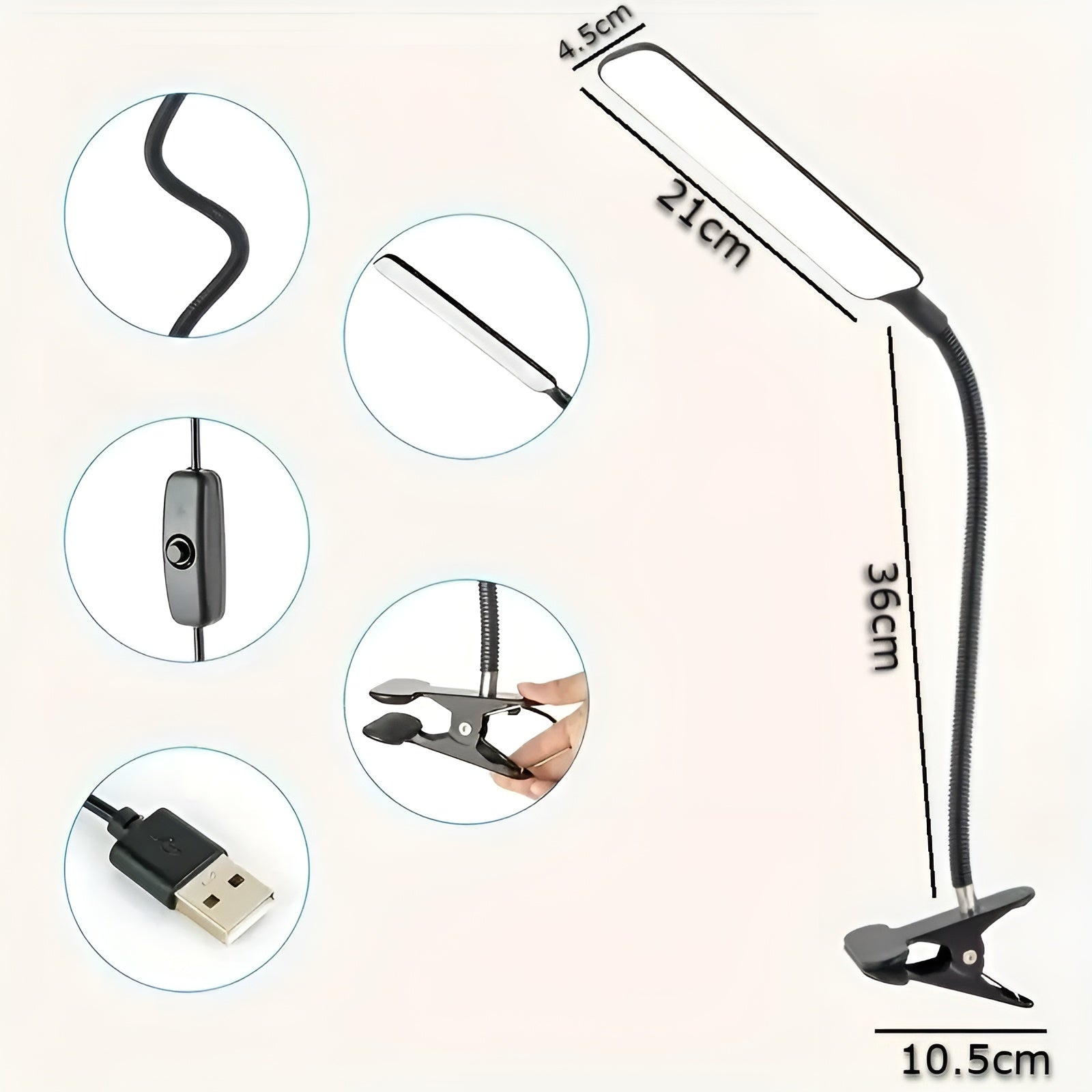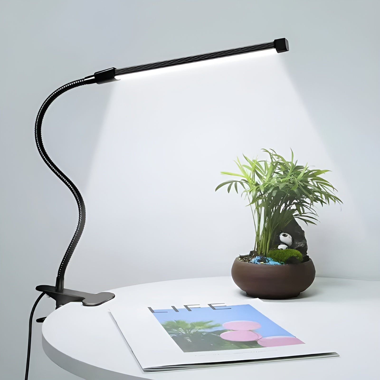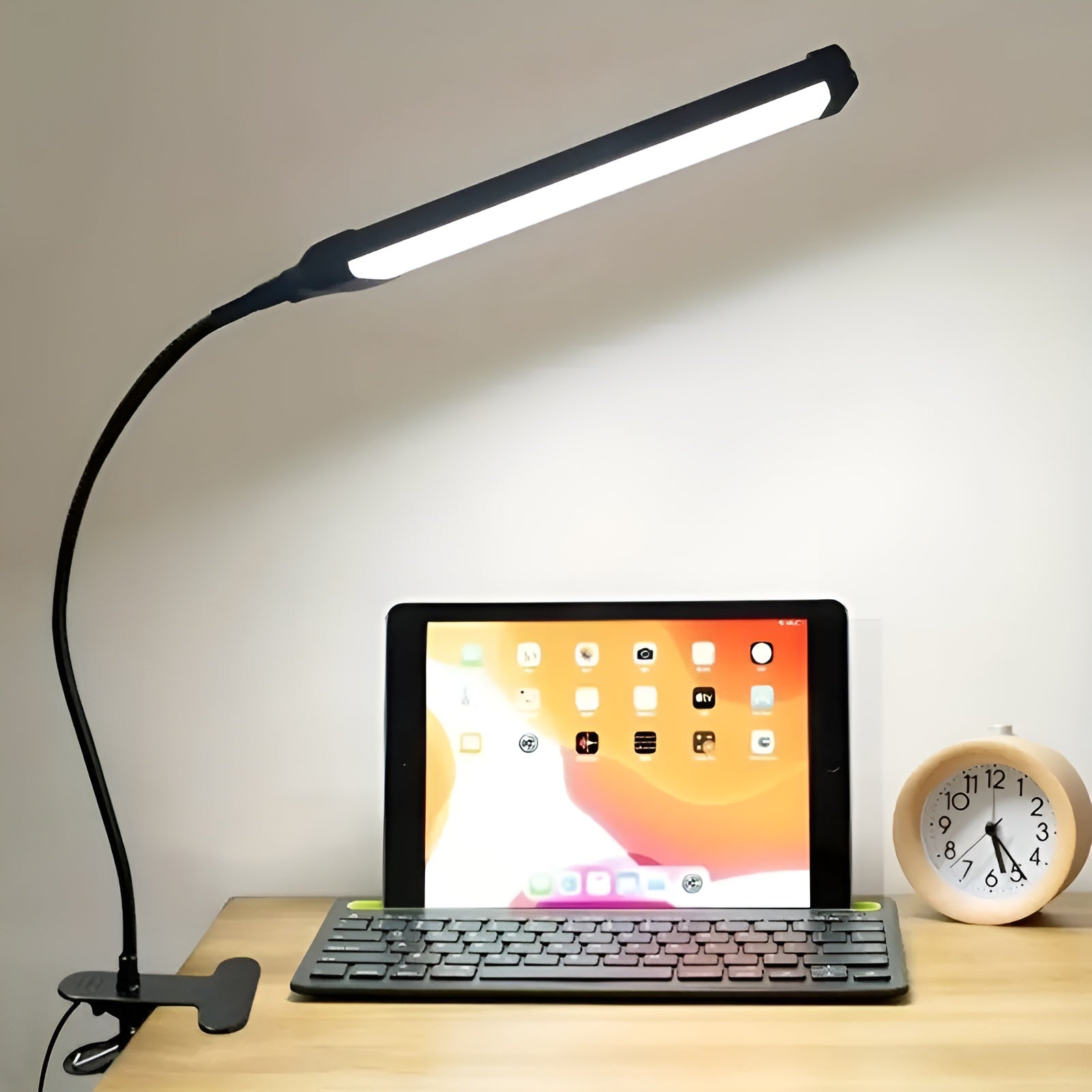 Su diseño portátil se adapta fácilmente a escritorios, mesas de noche o estanterías. El cuello flexible y la base tipo clip permiten ajustar la lámpara en un ángulo de 360°, asegurando la iluminación exacta donde la necesites.