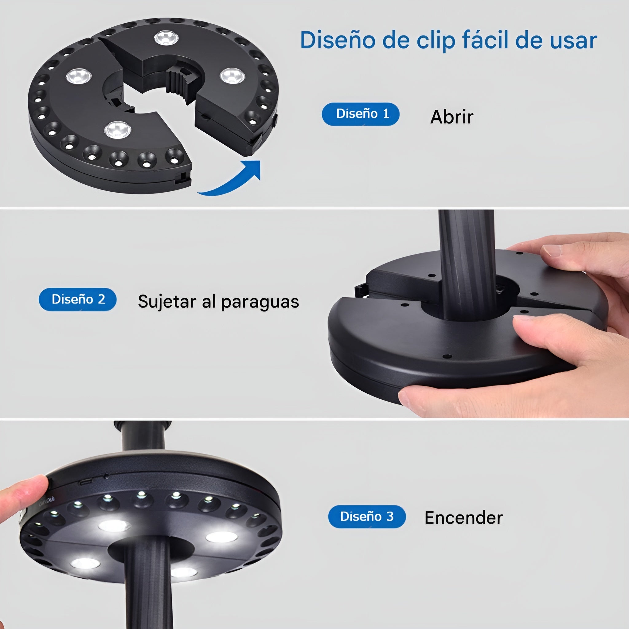 La Luz de Paraguas Portátil es la solución perfecta para disfrutar de tus espacios al aire libre con una iluminación práctica y eficiente. Diseñada para brindar comodidad y versatilidad, se adapta a sombrillas, carpas, patios y más, ofreciendo luz donde más la necesitas sin complicaciones.