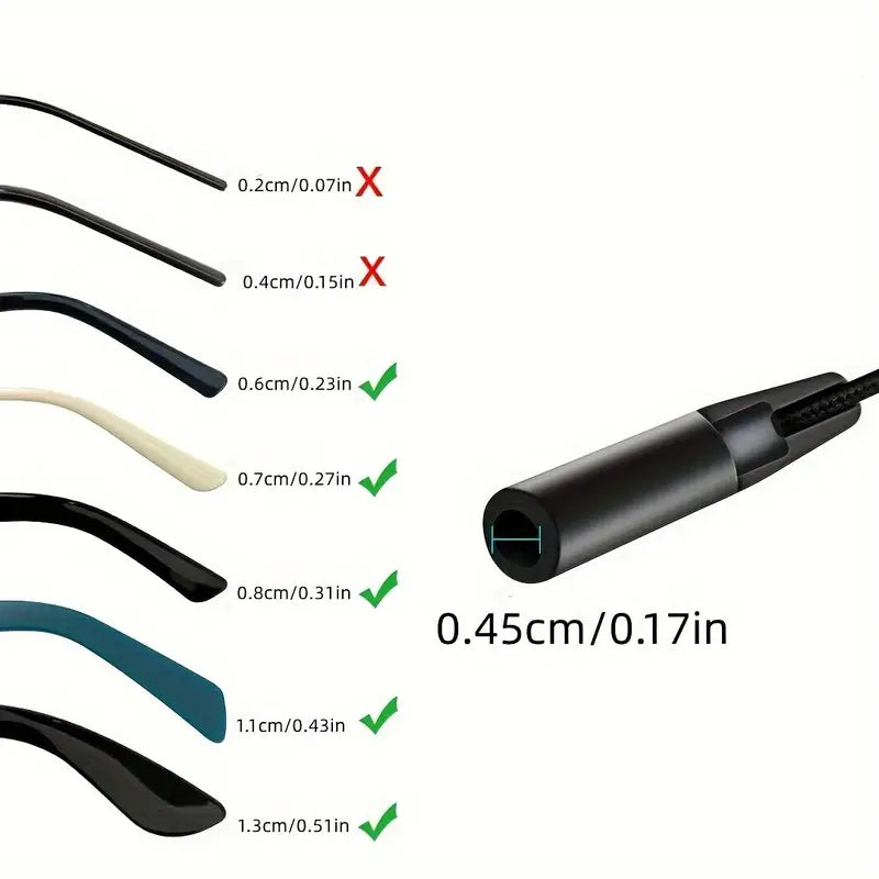Fabricada con silicona de alta elasticidad en ambos extremos, se adhiere firmemente a las patillas de las gafas, evitando que se deslicen incluso durante el sudor o movimientos bruscos. Ideal para correr, entrenar, andar en bicicleta o simplemente mantener tus gafas seguras en el cuello.