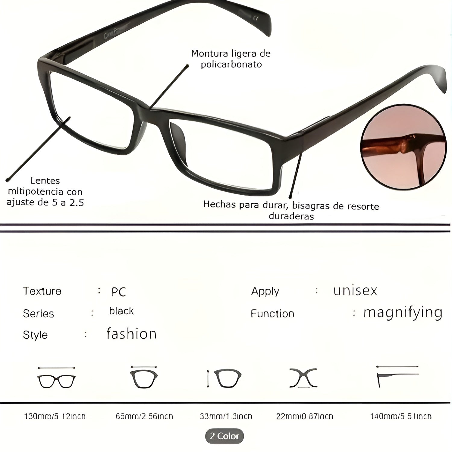 Corrección visual personalizada: Disponibles en potencias de 0.5 a 2.50, proporcionando una solución adecuada para distintas necesidades de visión.
