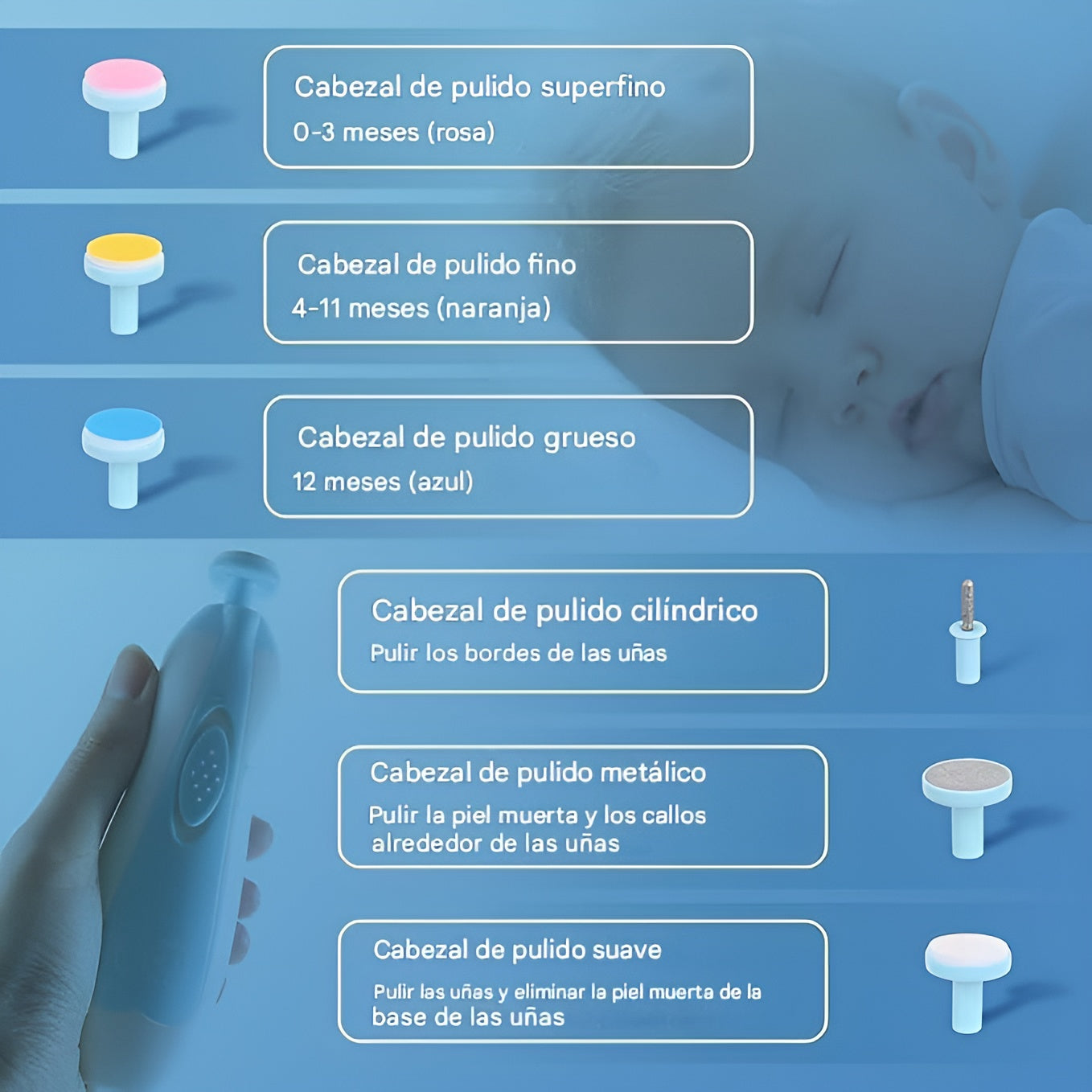 Con su pulido de 360°, suaviza las uñas sin dañar cutículas ni el lecho ungueal, perfecto para bebés sensibles al ruido gracias a su motor silencioso.