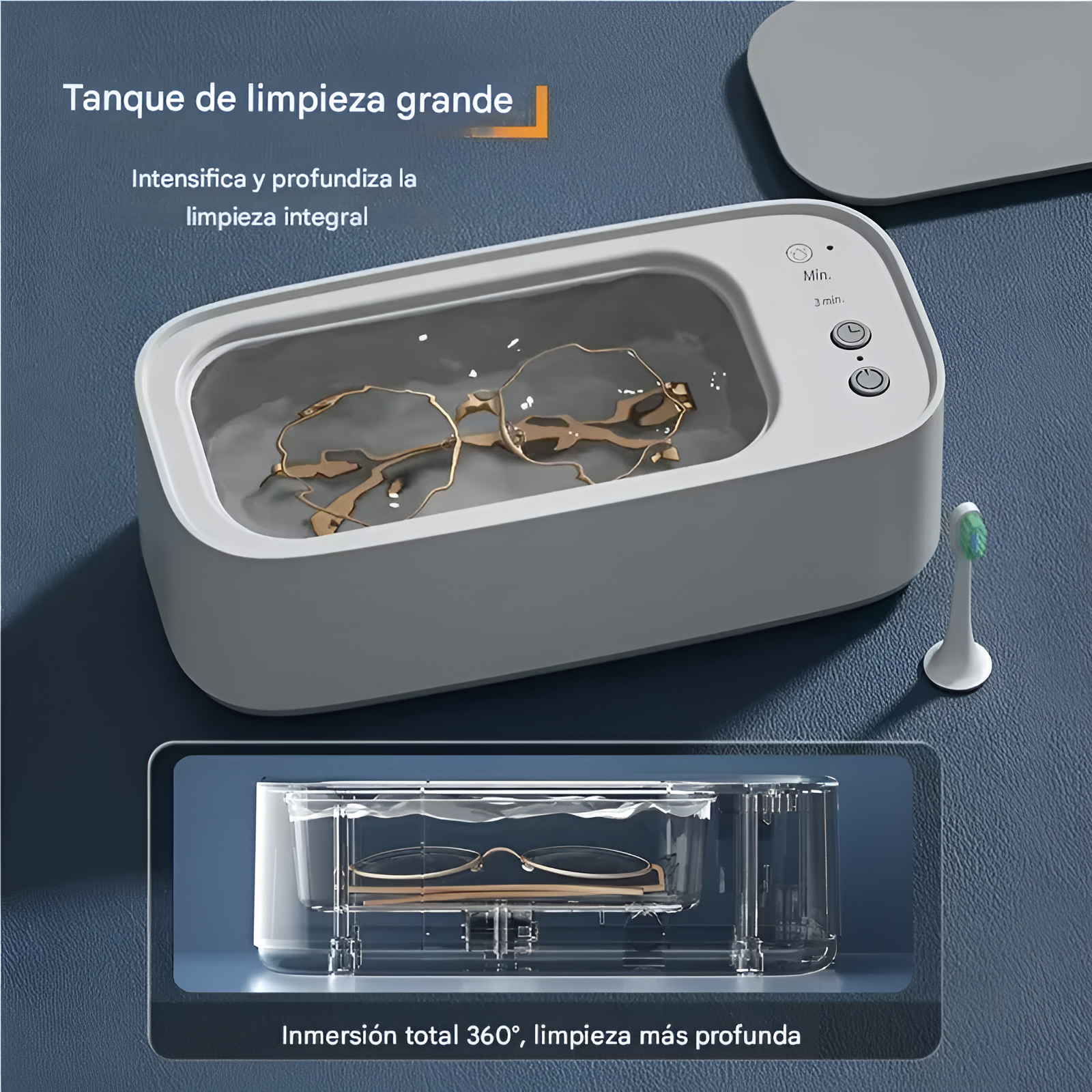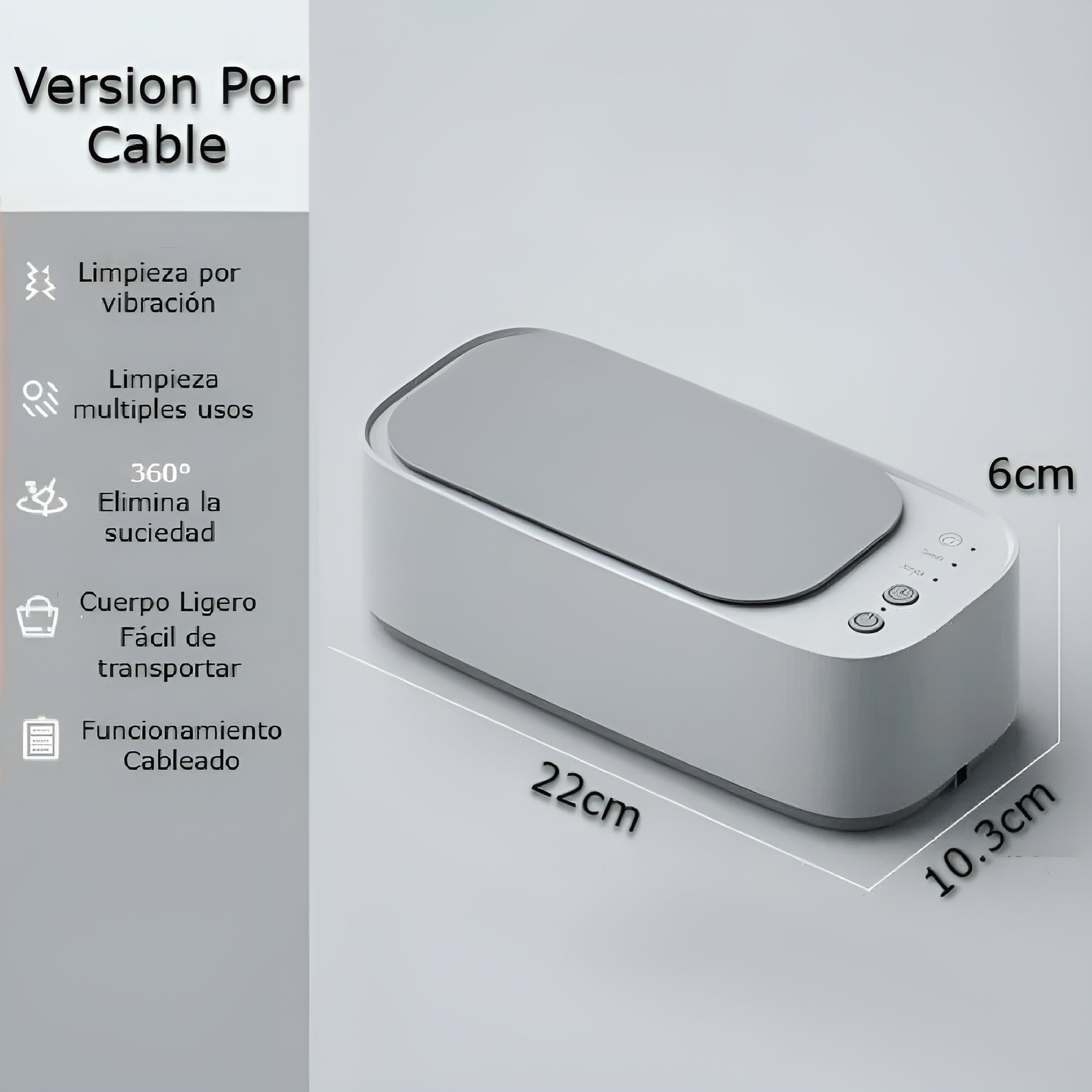 La base cuenta con 4 patas de goma antideslizantes que absorben vibraciones, garantizando estabilidad y evitando desplazamientos durante el proceso. Se utiliza con su cable de alimentación para dar funcionamiento, y su operación es sencilla y rápida: basta con presionar un botón y observar a través de la cubierta transparente cómo tus artículos quedan con una limpieza impecable.