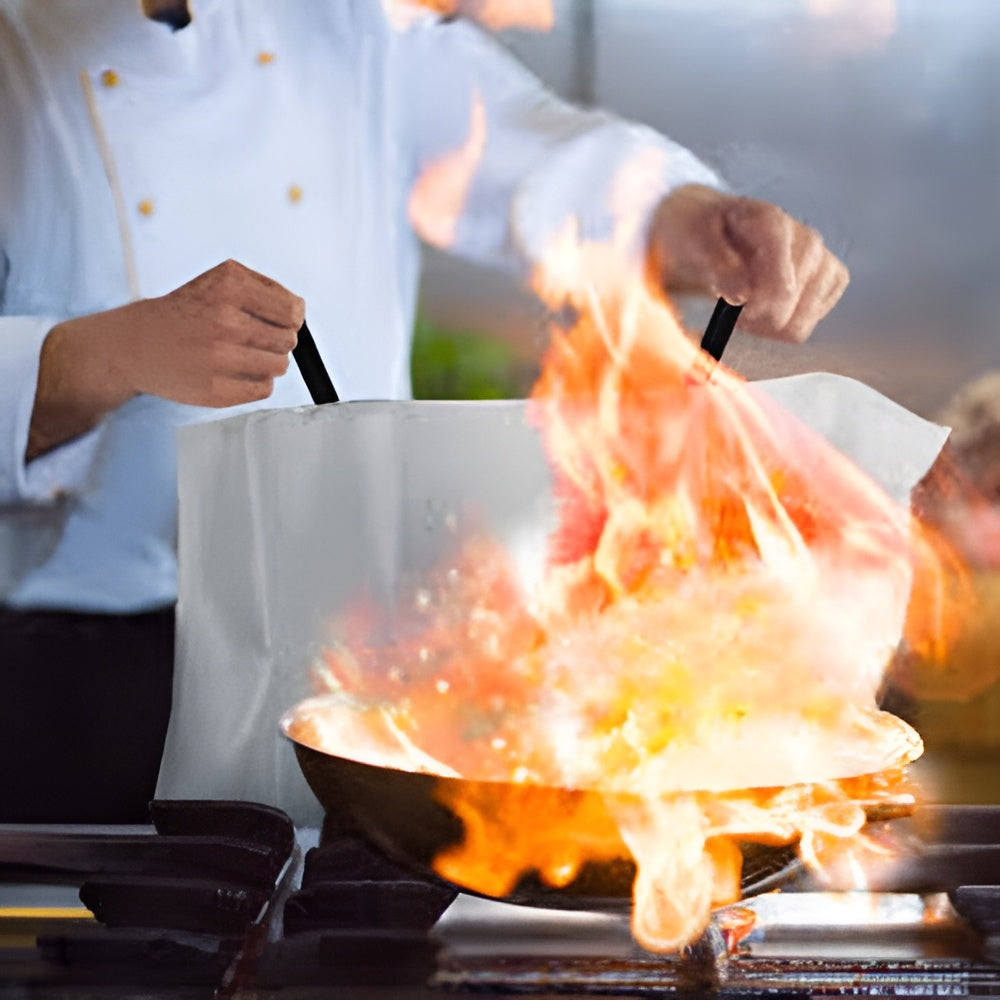 Material certificado de alta calidad Compuesta por dos capas de fibra de vidrio tejida y una película ignífuga interna, cumple con la norma EN-1869:1997 para incendios de cocción. Resiste temperaturas de hasta 1076 °F (580 °C).