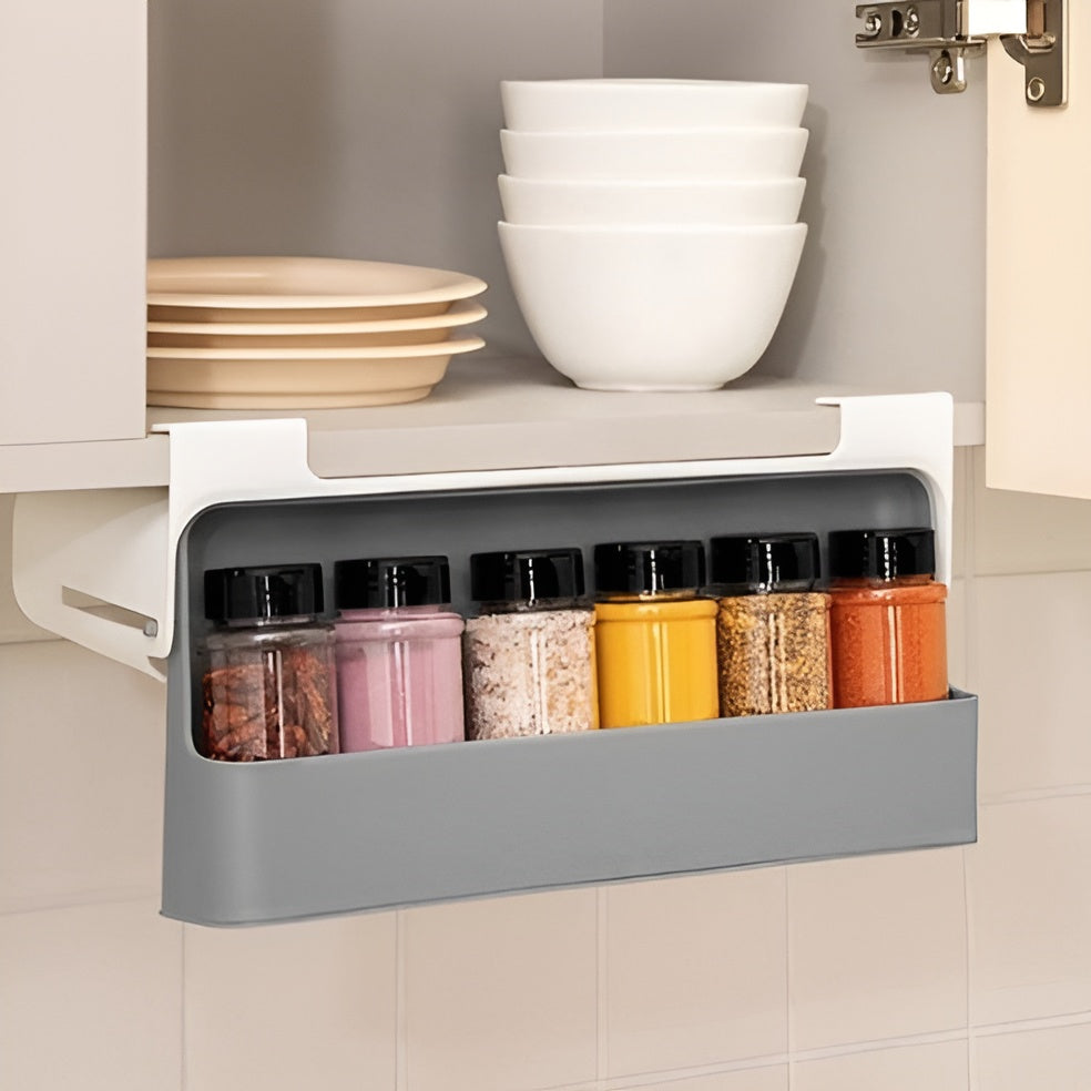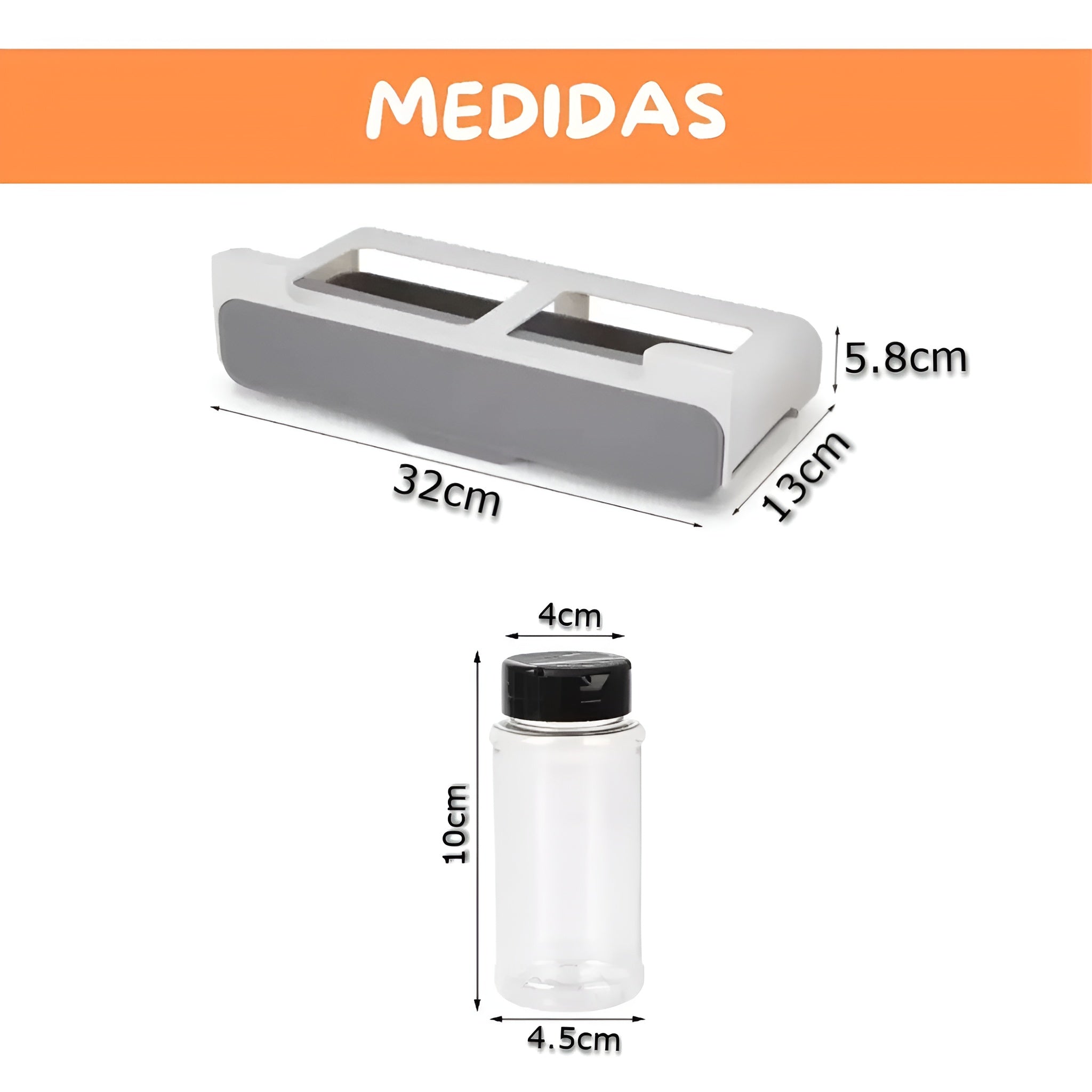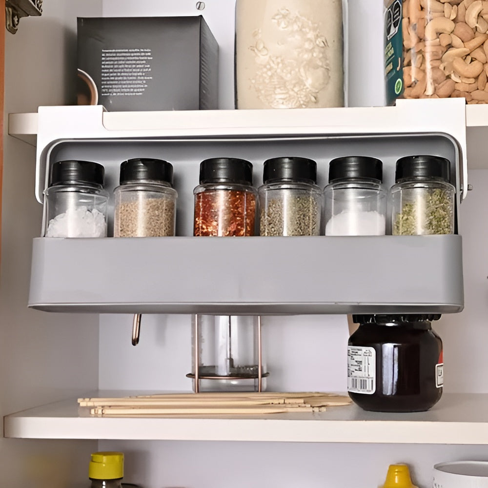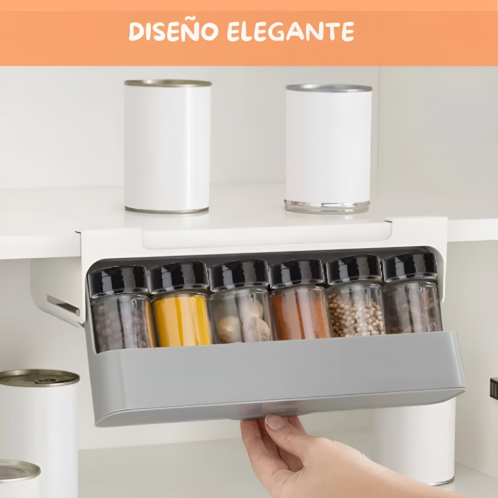 Fabricado con materiales plástico PE duraderos, ofrece una estructura firme y confiable para almacenar hasta seis frascos de especias estándar (no incluidos). Su compartimento extraíble permite acceder cómodamente a tus condimentos mientras cocinas, manteniéndolos seguros y bien organizados. El acabado en color gris aporta un toque moderno que se adapta a cualquier estilo de cocina.