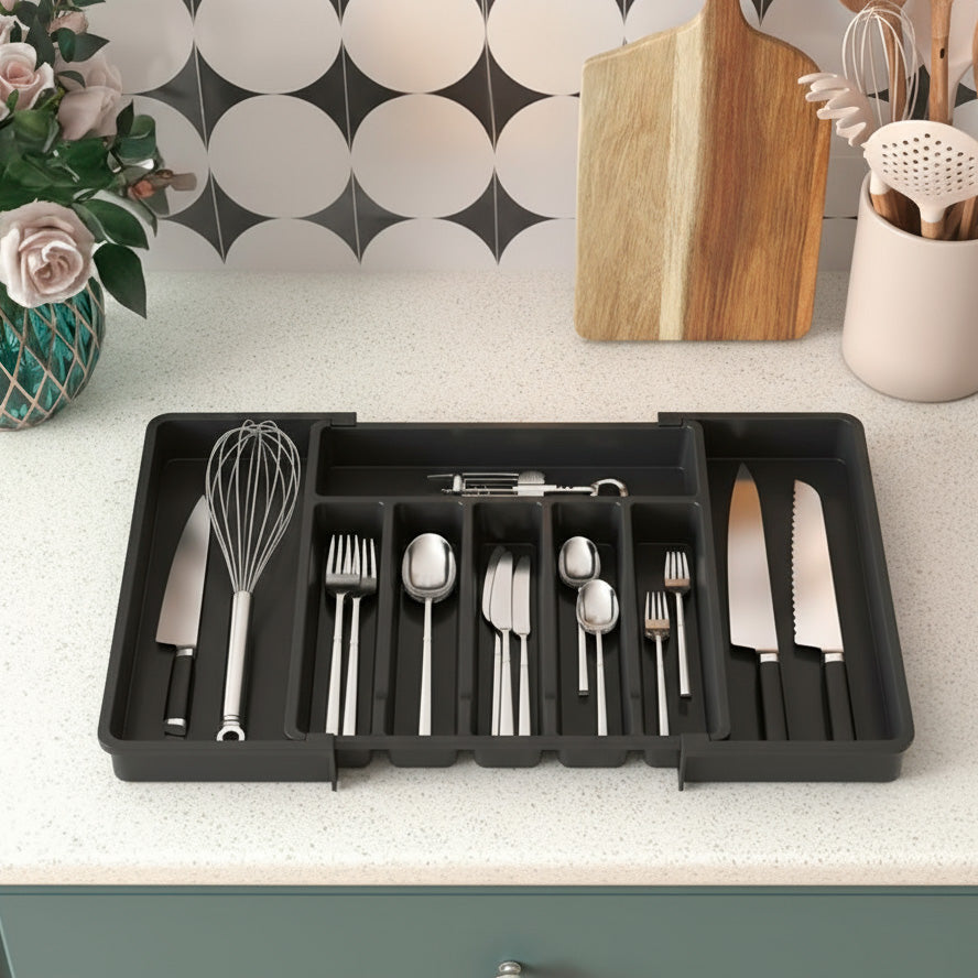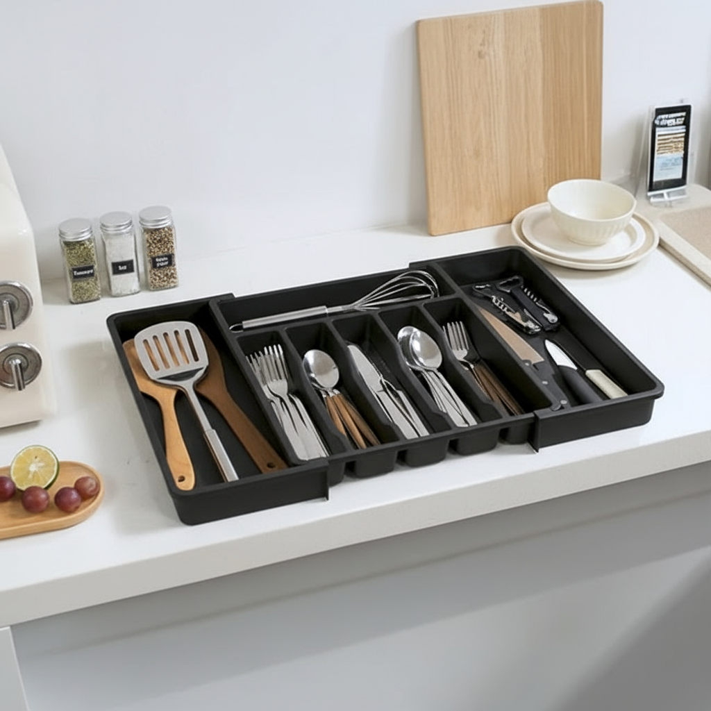 El organizador de gaveta extensible es una herramienta práctica y elegante para mantener el orden en cajones de cocina, baño, oficina o dormitorio. Su diseño ajustable permite adaptarlo a diferentes tamaños de gavetas, creando compartimientos personalizados para utensilios, accesorios, cosméticos o artículos de papelería.