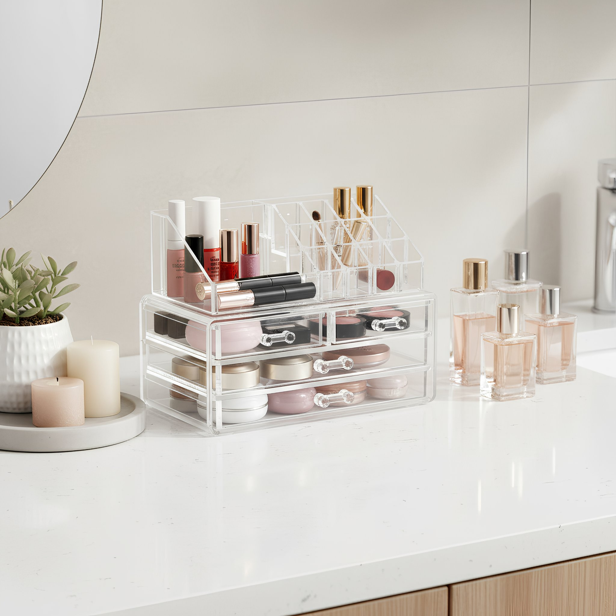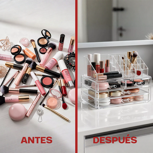 Este organizador de tocador transparente te permite mantener cosméticos, accesorios y productos de cuidado personal ordenados y siempre a la vista. Su diseño elegante en acrílico duradero aporta un toque sofisticado a cualquier tocador o baño. Cuenta con 16 compartimientos superiores y 4 cajones espaciosos, ideales para brochas, labiales, paletas y joyas. Facilita la organización diaria, ahorrando tiempo y reduciendo el desorden. Además, es una excelente idea de regalo, práctica y elegante para cualquier ocasión.