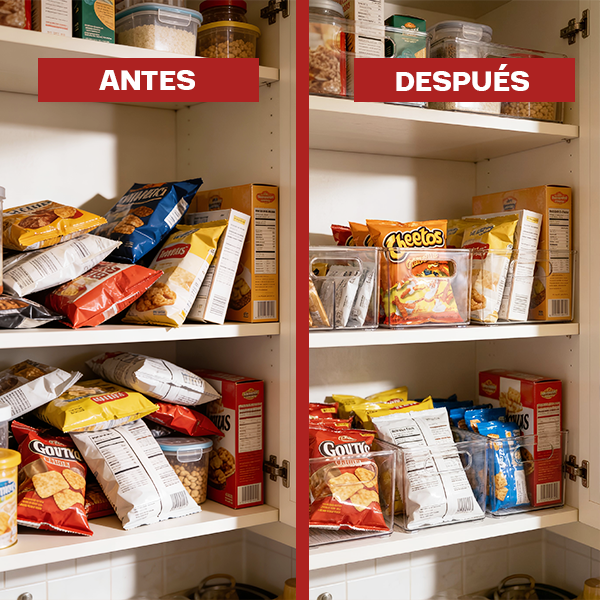 Este organizador de cocina es ideal para mantener el refrigerador, la despensa o la cocina limpios y bien organizados. Su gran capacidad y diseño con 4 secciones permite separar fácilmente snacks, alimentos pequeños y artículos esenciales. Incluye asa lateral para un acceso cómodo y es apto para refrigerador y congelador. Fabricado en plástico transparente sin BPA, es resistente, seguro para alimentos y fácil de limpiar. Una solución práctica y duradera para simplificar el almacenamiento en cualquier espacio del hogar.