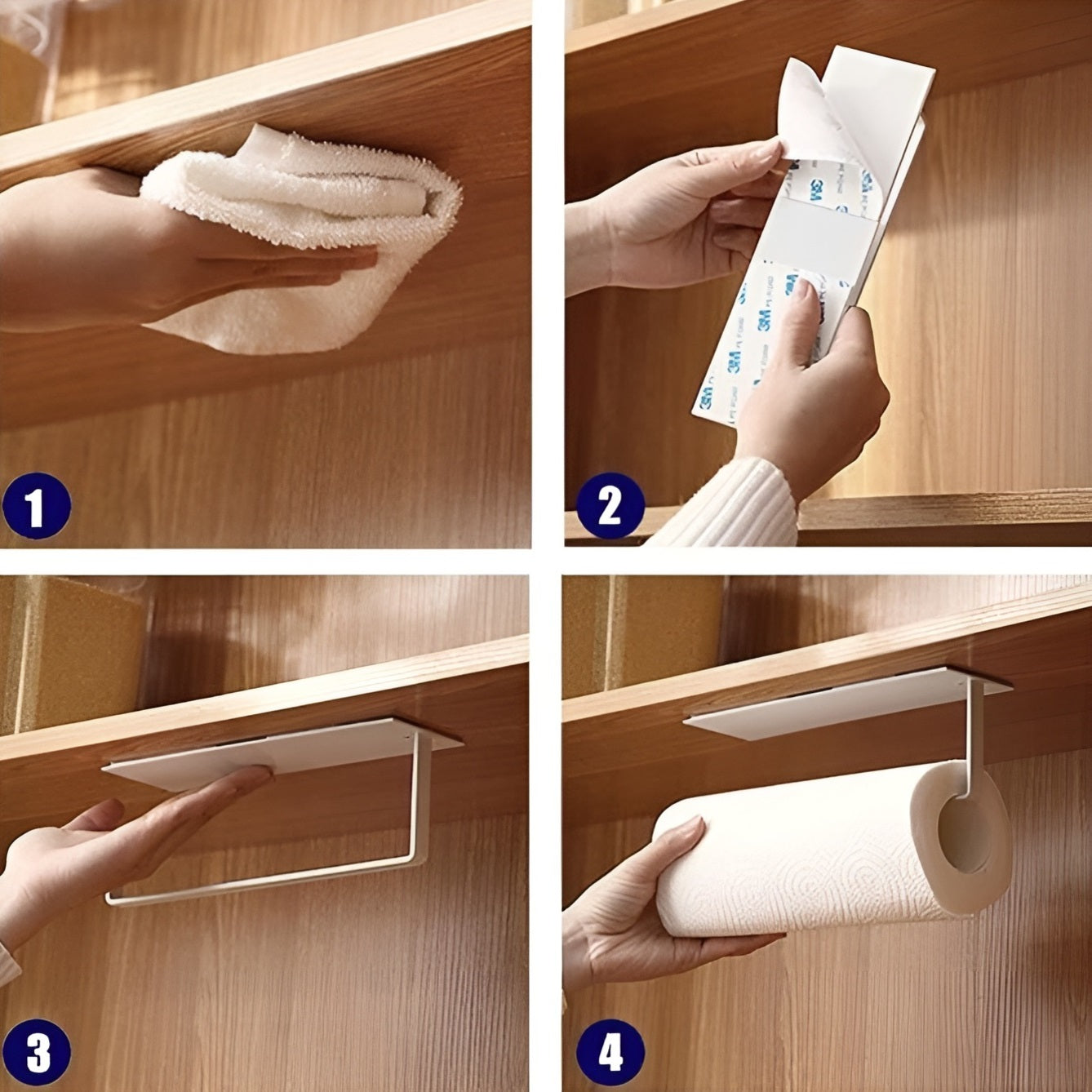 La instalación es rápida y sencilla: limpia y seca la superficie, retira el adhesivo posterior y presiona firmemente. Tras esperar 24 horas, estará listo para usar con papel de cocina, toallas, bolsas o envolturas plásticas.
