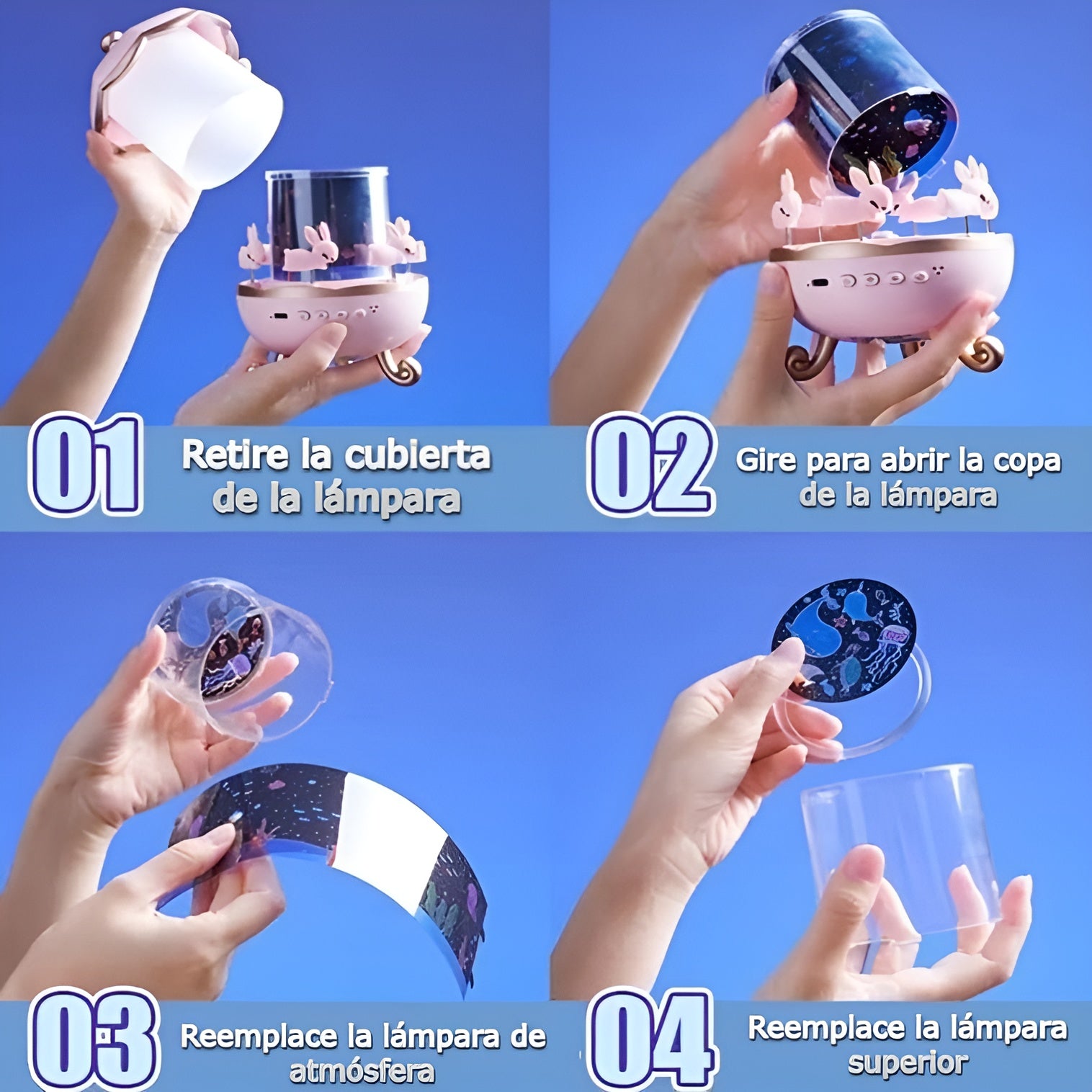 Incluye 6 películas intercambiables con diseños encantadores como estrellas, galaxias, conejitos y más. Cambia el tema según el momento y crea escenarios únicos que estimulan la imaginación de los más pequeños.
