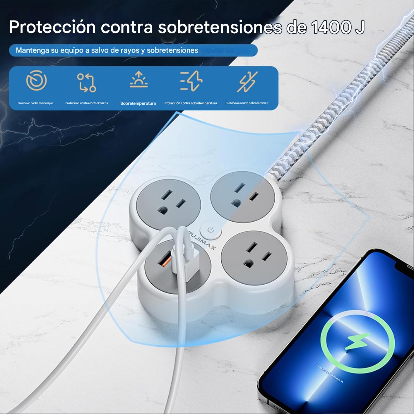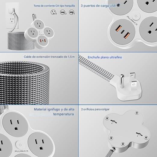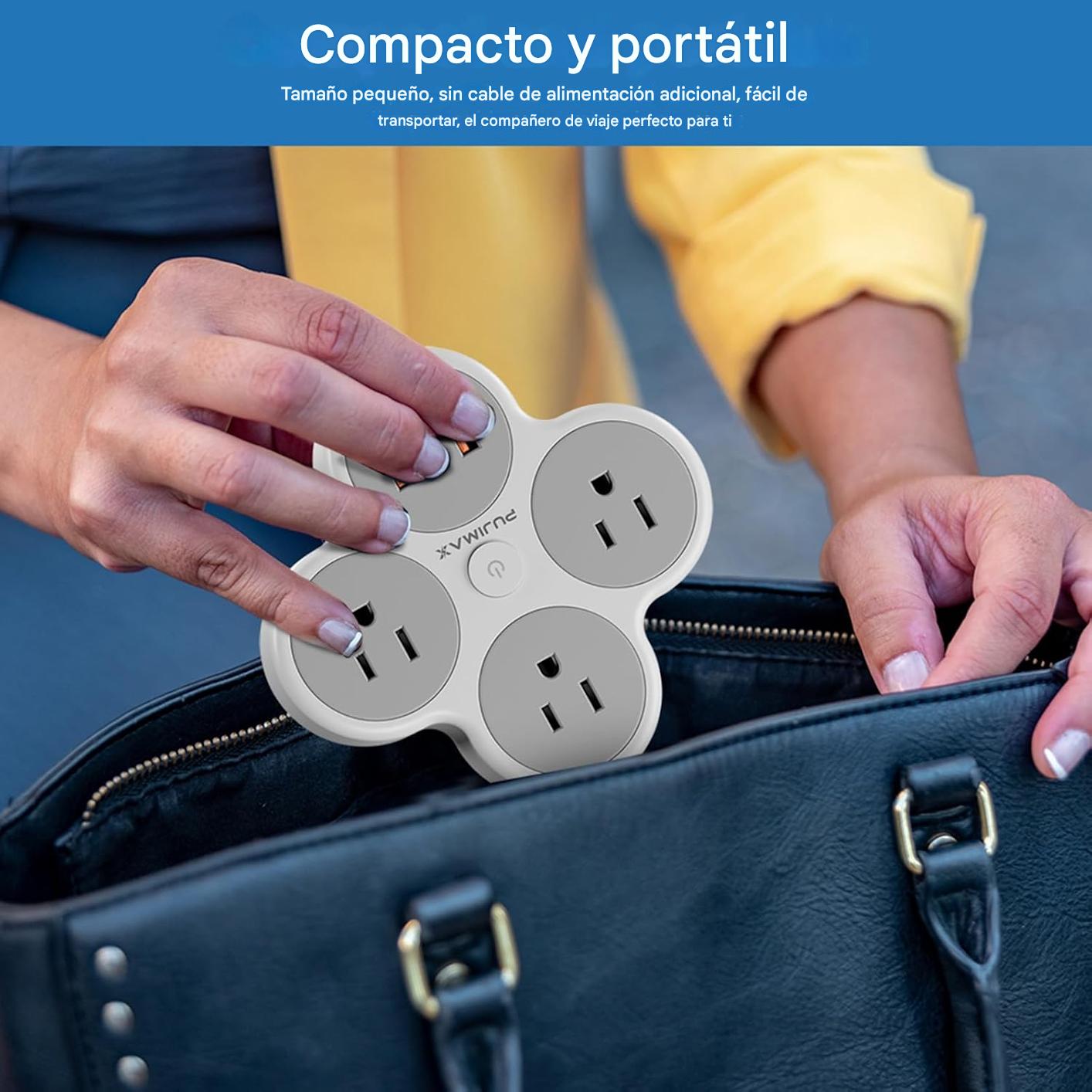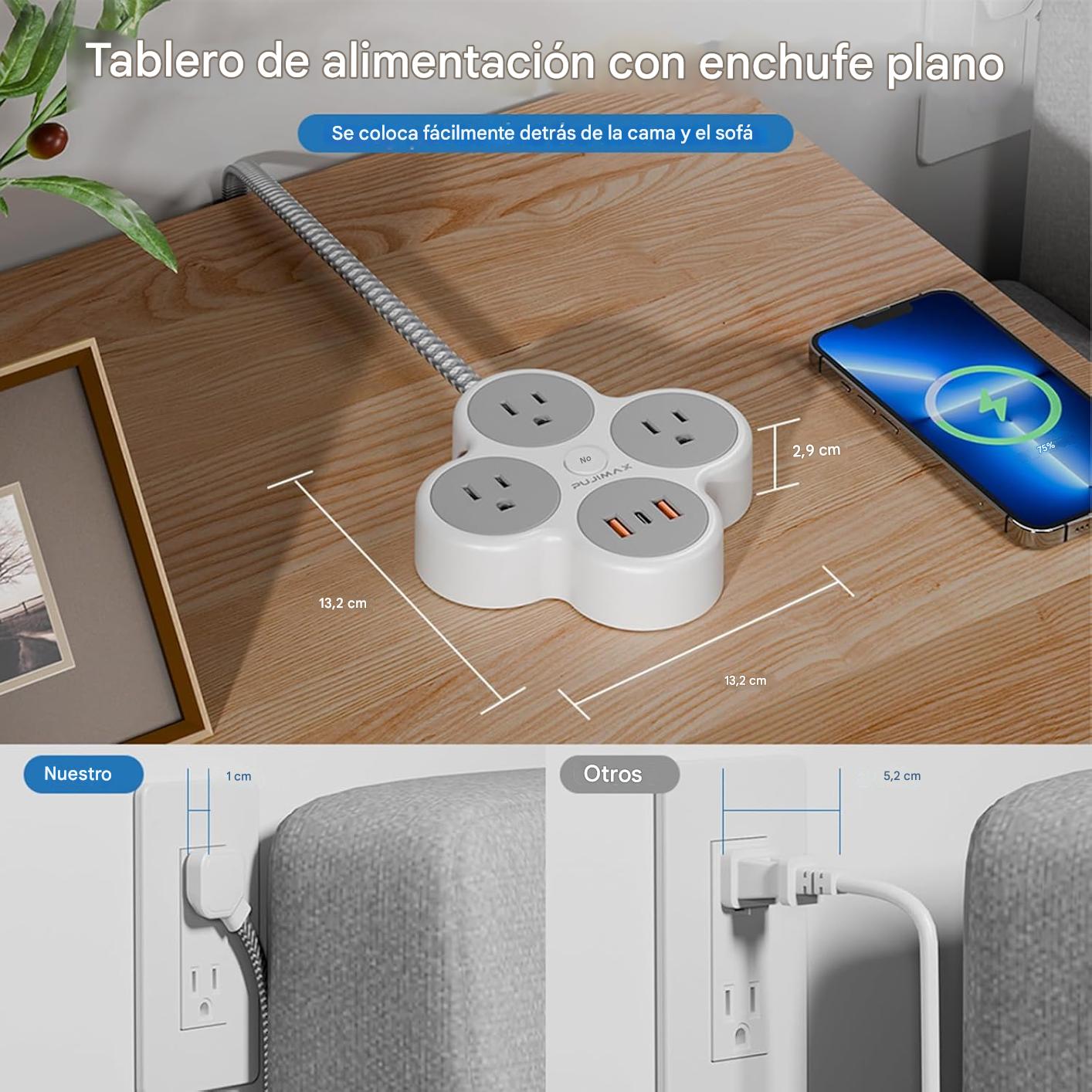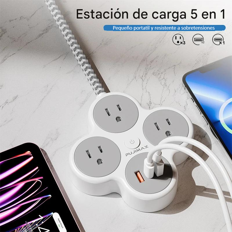 Su diseño en forma de trebol permite conectar varios dispositivos sin que se estorben entre si. Perfecta para el hogar, oficina o viajes, gracias a su tamaño portatil y resistente