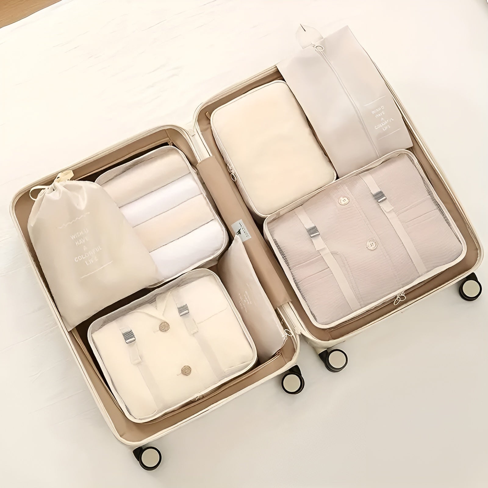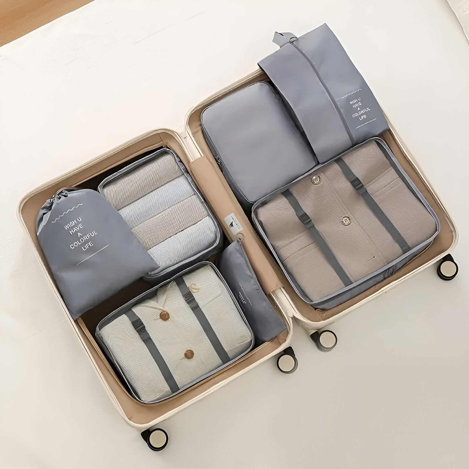 Almacenamiento completo y versátil Incluye 4 cubos para ropa, 2 bolsas para zapatos y cosméticos, 1 para ropa interior y 1 organizador de cables y accesorios. Perfecto para mantener cada categoría bien separada.