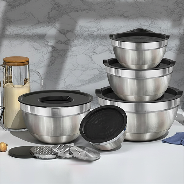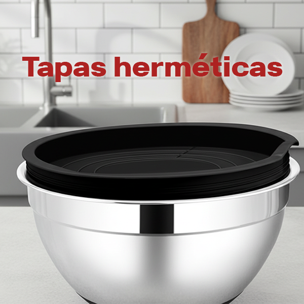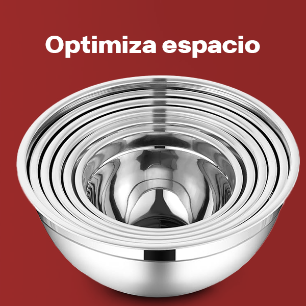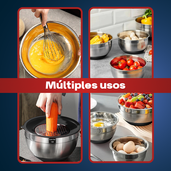Set de bowls inoxidables fabricados en acero inoxidable con tapas de plástico, diseñado en seis tamaños distintos y apilables que van desde 0.7 L hasta 4.6 L, ideal para mezclar, batir, almacenar y transportar alimentos de forma práctica y segura; incluye 3 ralladores ajustables con opciones de huecos finos, gruesos y rebanador integrado, ofrece sellado hermético que evita derrames y protege del polvo, y cuenta con interior pulido que facilita la liberación de los alimentos, aportando versatilidad, orden y eficiencia en la cocina.