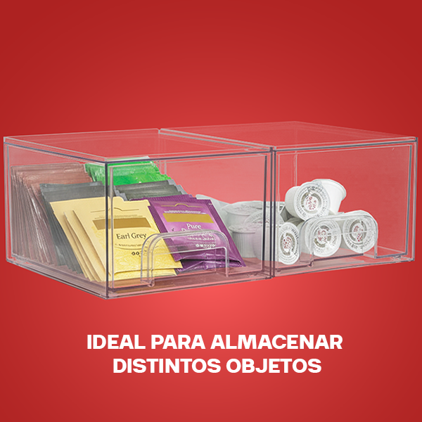 Estos organizadores acrílicos multiusos son ideales para mantener cada espacio del hogar ordenado, desde el baño y la cocina hasta la despensa o el tocador. Su diseño apilable permite ahorrar espacio y adaptarlos según tus necesidades, usándolos en vertical o uno al lado del otro. Incluyen asas integradas para un manejo cómodo y almohadillas antideslizantes que aportan mayor estabilidad. Fabricados en plástico resistente sin BPA, son transparentes, fáciles de limpiar y combinan con cualquier estilo de decoración, ayudándote a mantener todo visible, organizado y libre de polvo.