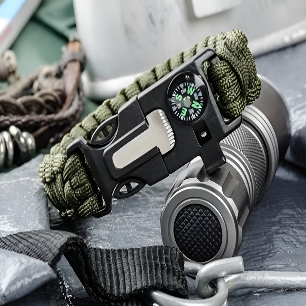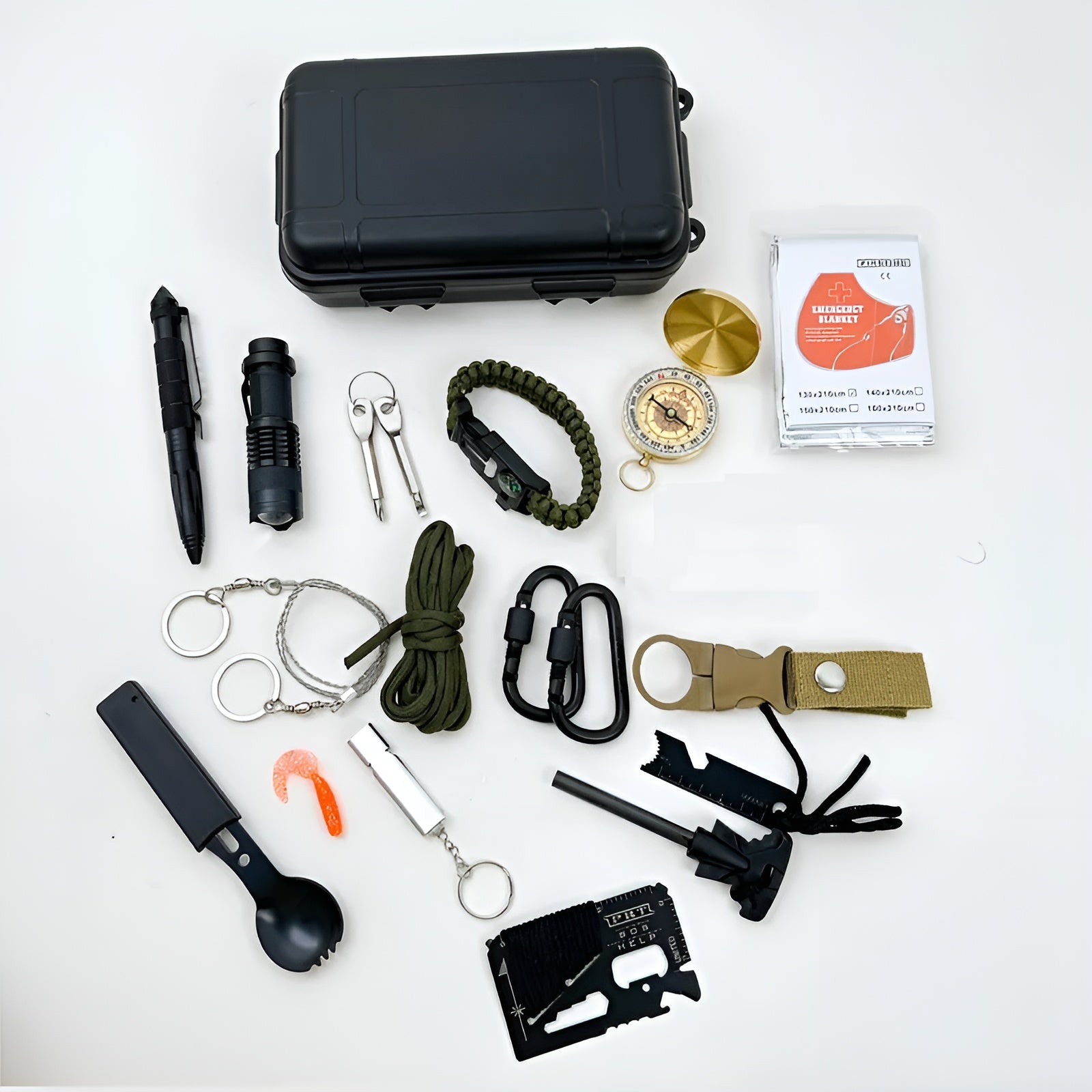 Incluye 13 accesorios multifuncionales cuidadosamente seleccionados: brújula de alta precisión, pulsera de cuerda, linterna táctica, bolígrafo táctico rompe vidrios, manta térmica, iniciador de fuego, yesca, sierra de alambre, clip para botella, spork 8 en 1, silbato y caja impermeable con interior acolchado.