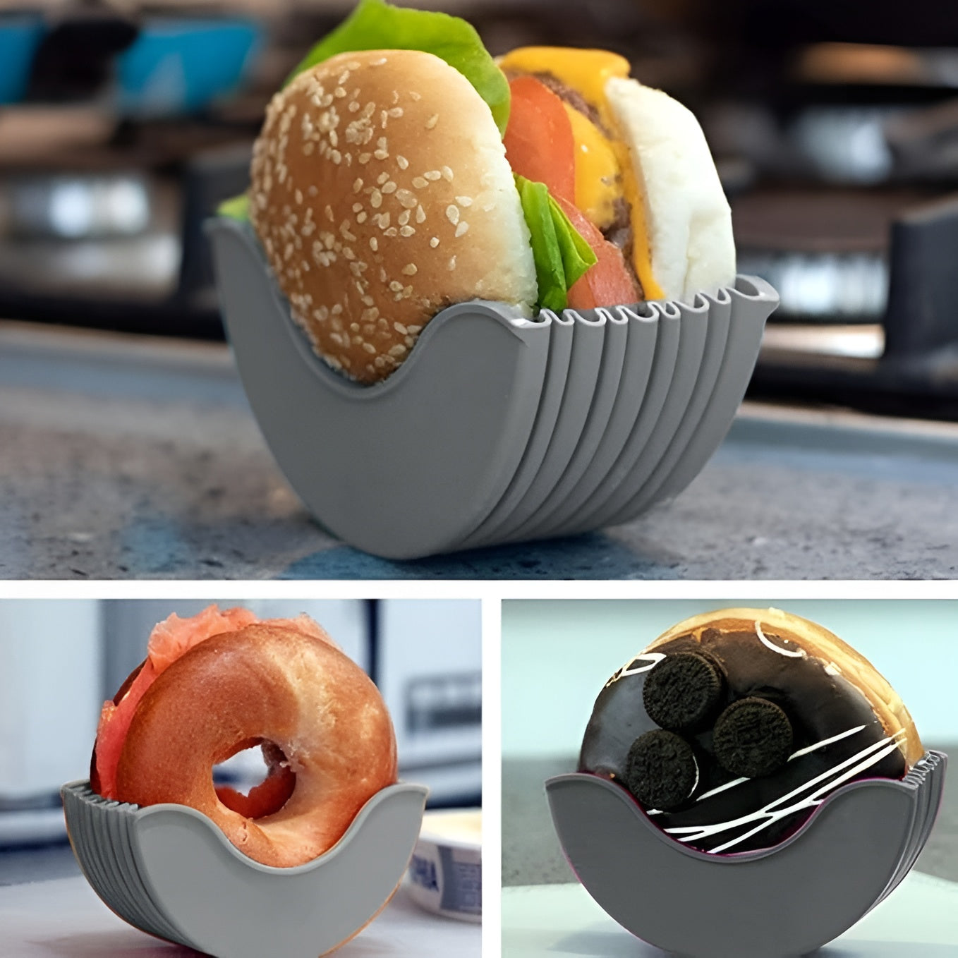 El soporte de Silicona Ajustable para Hamburguesas es el accesorio ideal para disfrutar tus comidas favoritas de forma limpia, cómoda y ecológica. Diseñada para adaptarse a cualquier tamaño de hamburguesa, esta herramienta transforma la manera en que comes, brindando soporte firme y una experiencia sin derrames ni contacto innecesario.