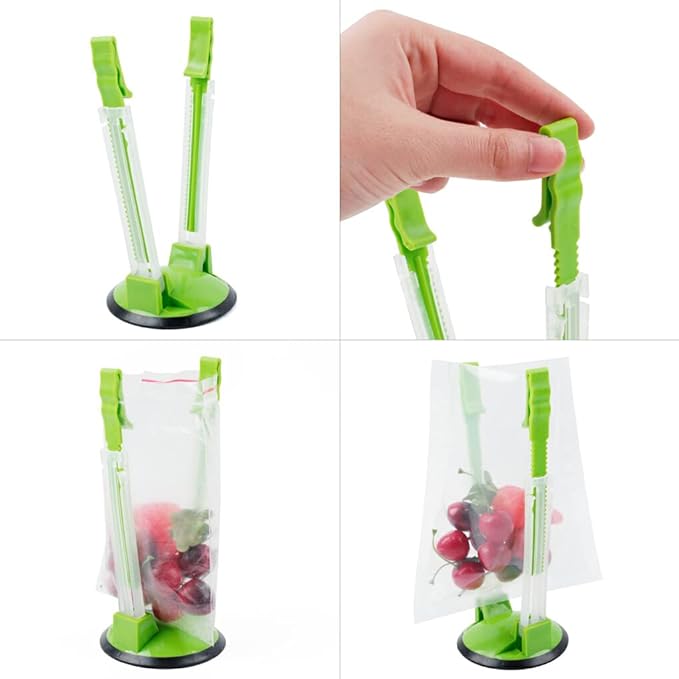 - Comodidad manos libres: Sujeta la bolsa de alimentos fácilmente debajo de los clips y comienza a llenar sin preocupaciones. Este práctico soporte te permite llenar las bolsas de almacenamiento sin esfuerzo, ofreciéndote la comodidad de tener "un par extra de manos" en la cocina, evitando derrames o accidentes.