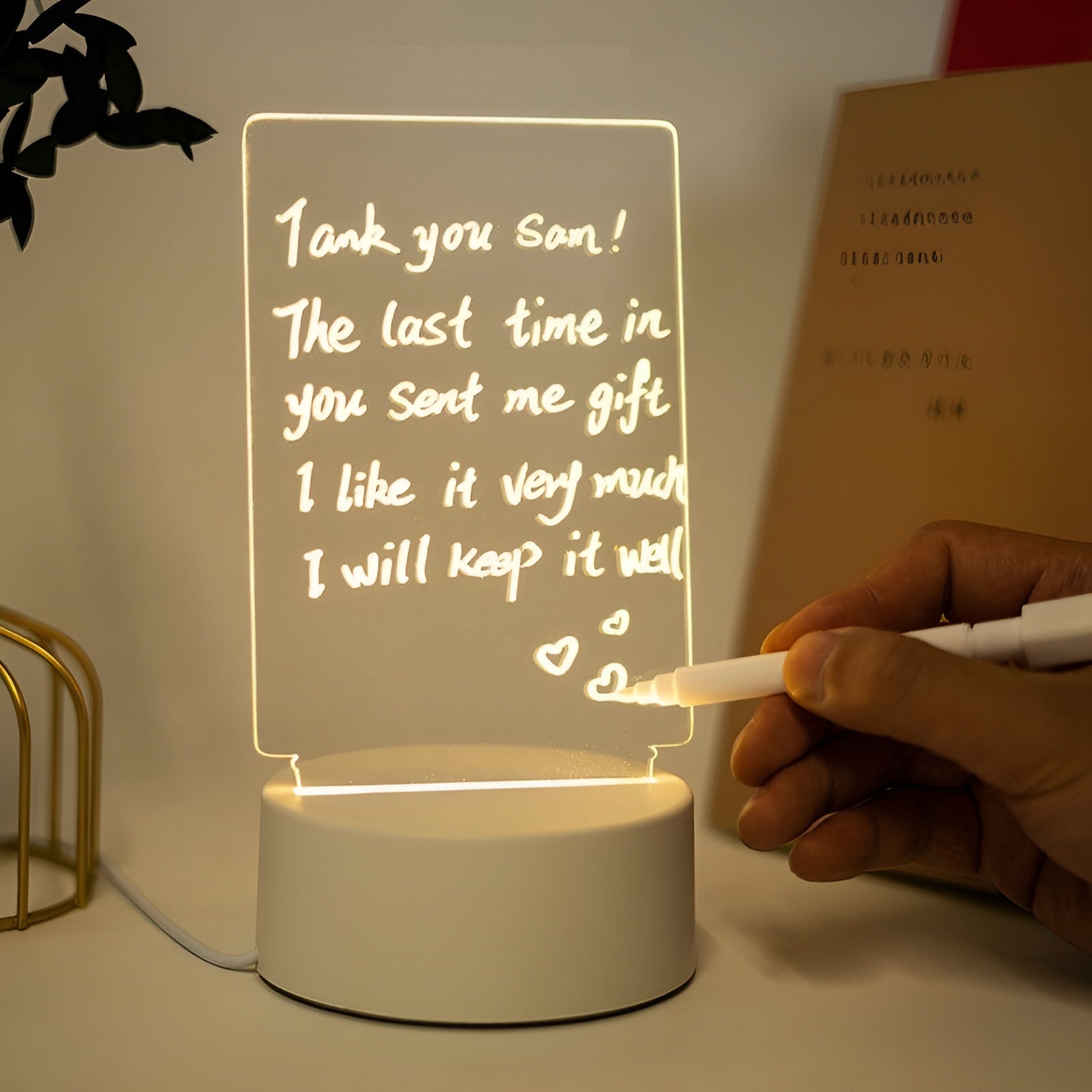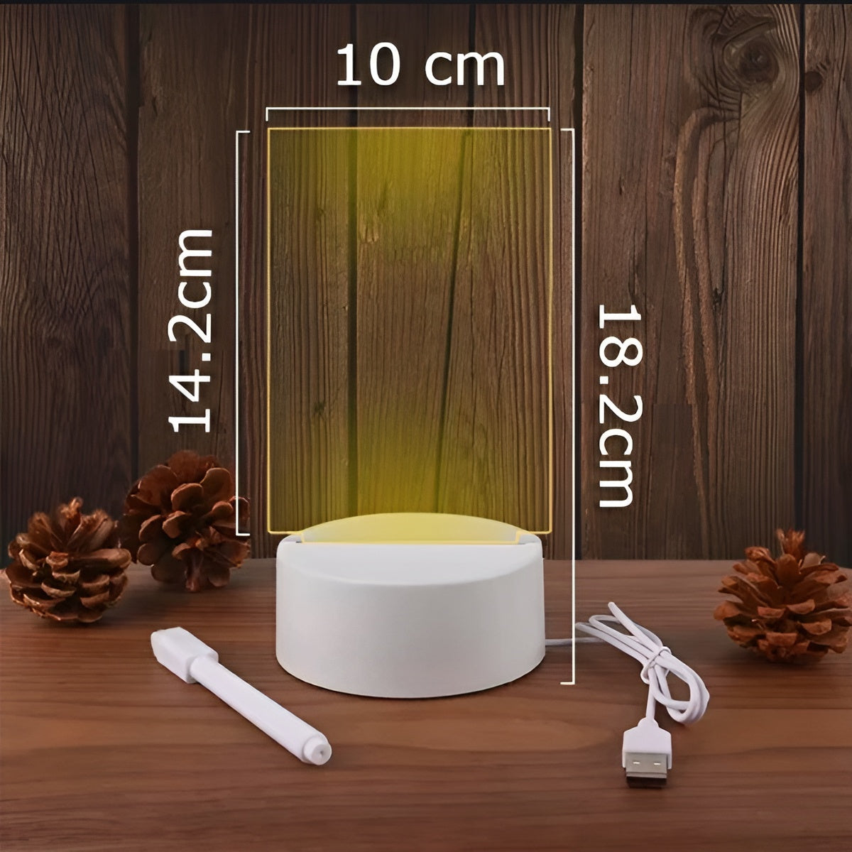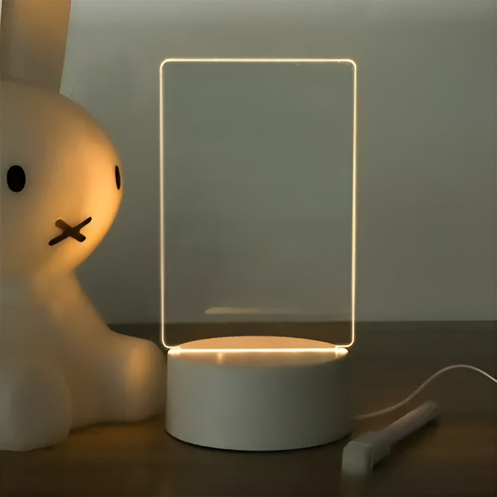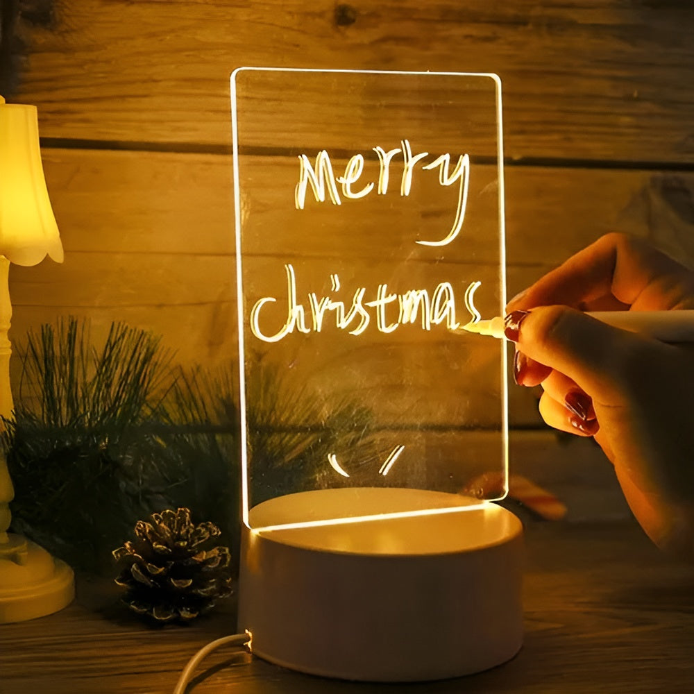 Fabricado en acrílico transparente de borrado en seco, permite escribir mensajes creativos con el bolígrafo especial incluido y borrarlos fácilmente con el borrador incorporado. La base de Plástico ABS, elegante y resistente, está incrustada con una tira LED. Al encenderla con su USB, el panel se ilumina con un brillo cálido y romántico, creando un ambiente acogedor y sofisticado.