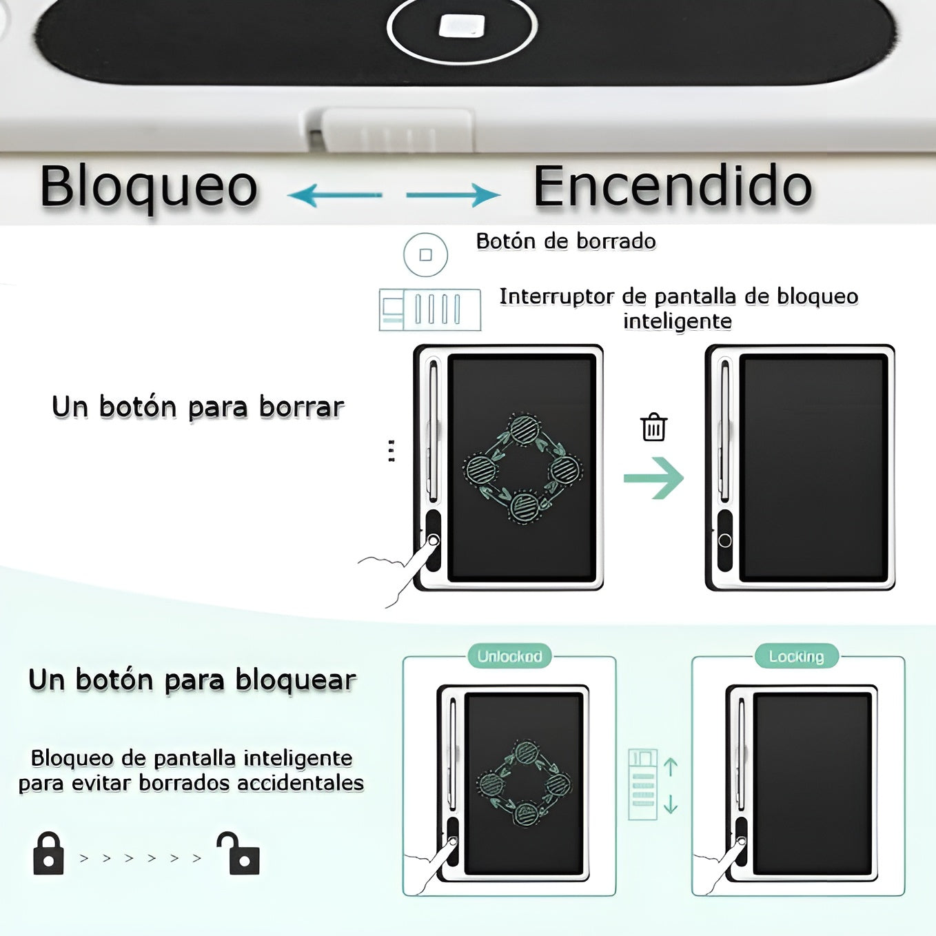 Fácil de usar: Puedes escribir con el lápiz incluido, otros instrumentos o incluso con los dedos. El contenido se borra fácilmente y el botón de bloqueo de pantalla evita eliminaciones accidentales.