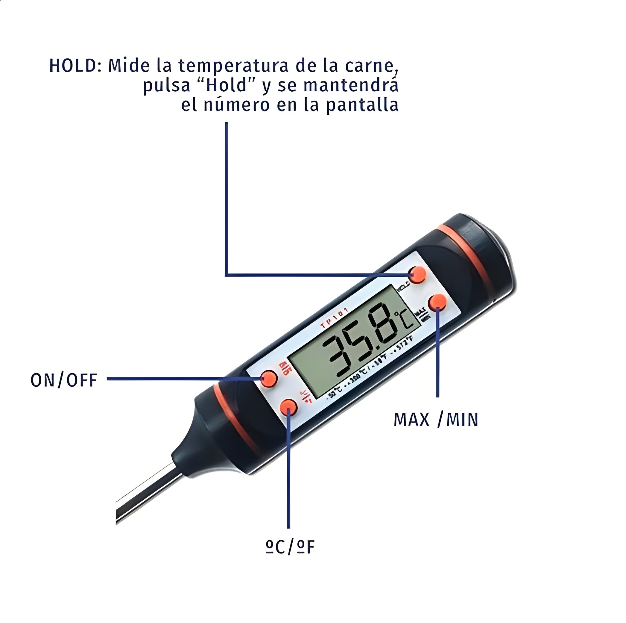 Función "Hold" para mayor precisión: Fija la temperatura en pantalla para consultarla más adelante, ideal al experimentar con nuevas técnicas culinarias.