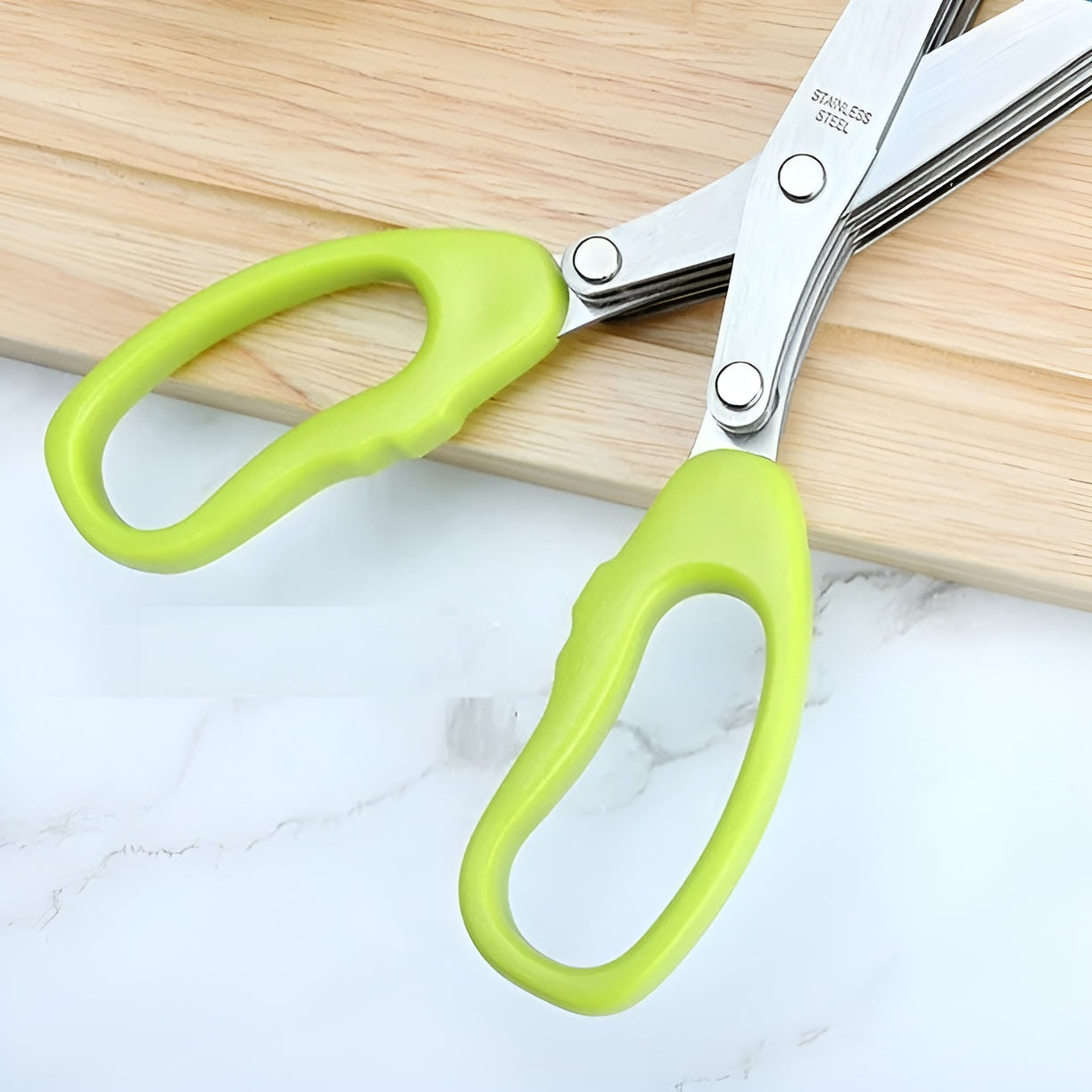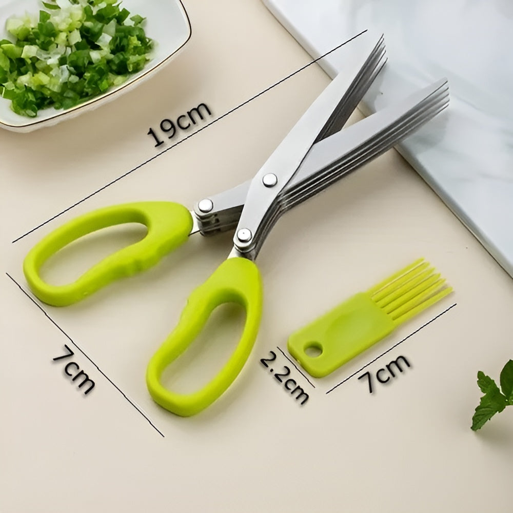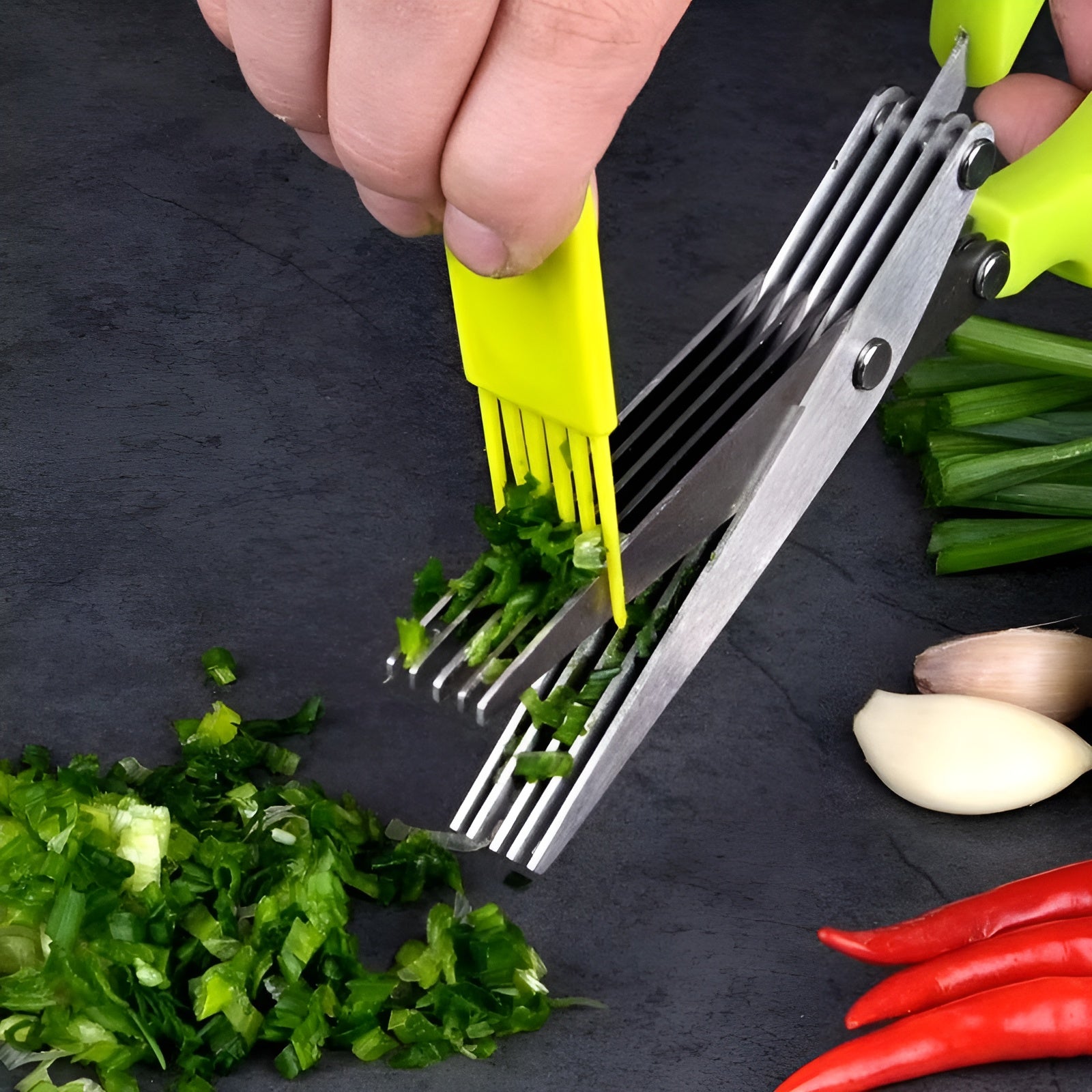 Transforma tu experiencia en la cocina con nuestra tijera multiusos de 5 hojas, diseñada para ofrecerte cortes precisos, rápidos y sin esfuerzo. Ideal para quienes disfrutan cocinar con estilo y eficiencia, esta herramienta te permite picar hierbas frescas, cortar carne y pollo, rebanar verduras y mucho más, sin complicaciones ni utensilios adicionales.