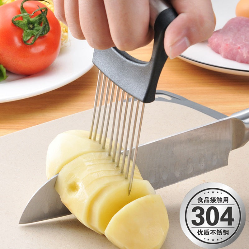 ¡Nuestro soporte de cebolla es más que solo un utensilio para cortar cebollas! Si no quieres tocar la cebolla, este dispositivo será tu gran solución. Con sus dientes de acero inoxidable ultra afilados, puedes perforar incluso las verduras más duras, como zanahorias y papas, sin esfuerzo. Obtén rebanadas perfectas y prepara tus ingredientes de manera eficiente sin tener que preocuparte por cortes accidentales o lesiones en tus dedos.